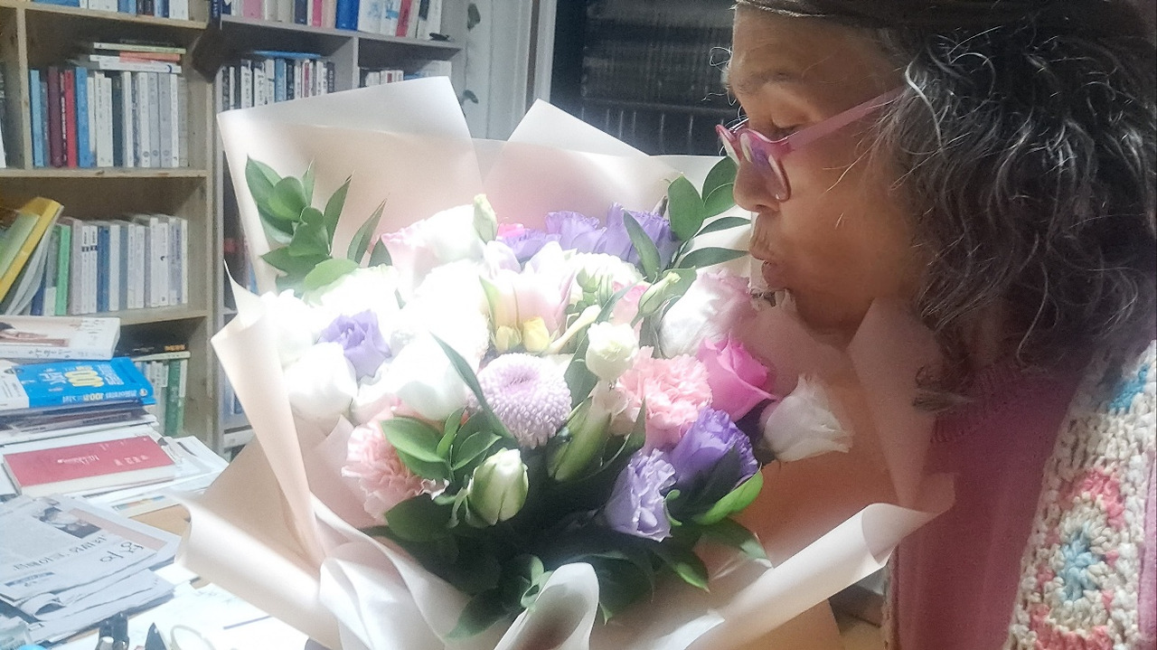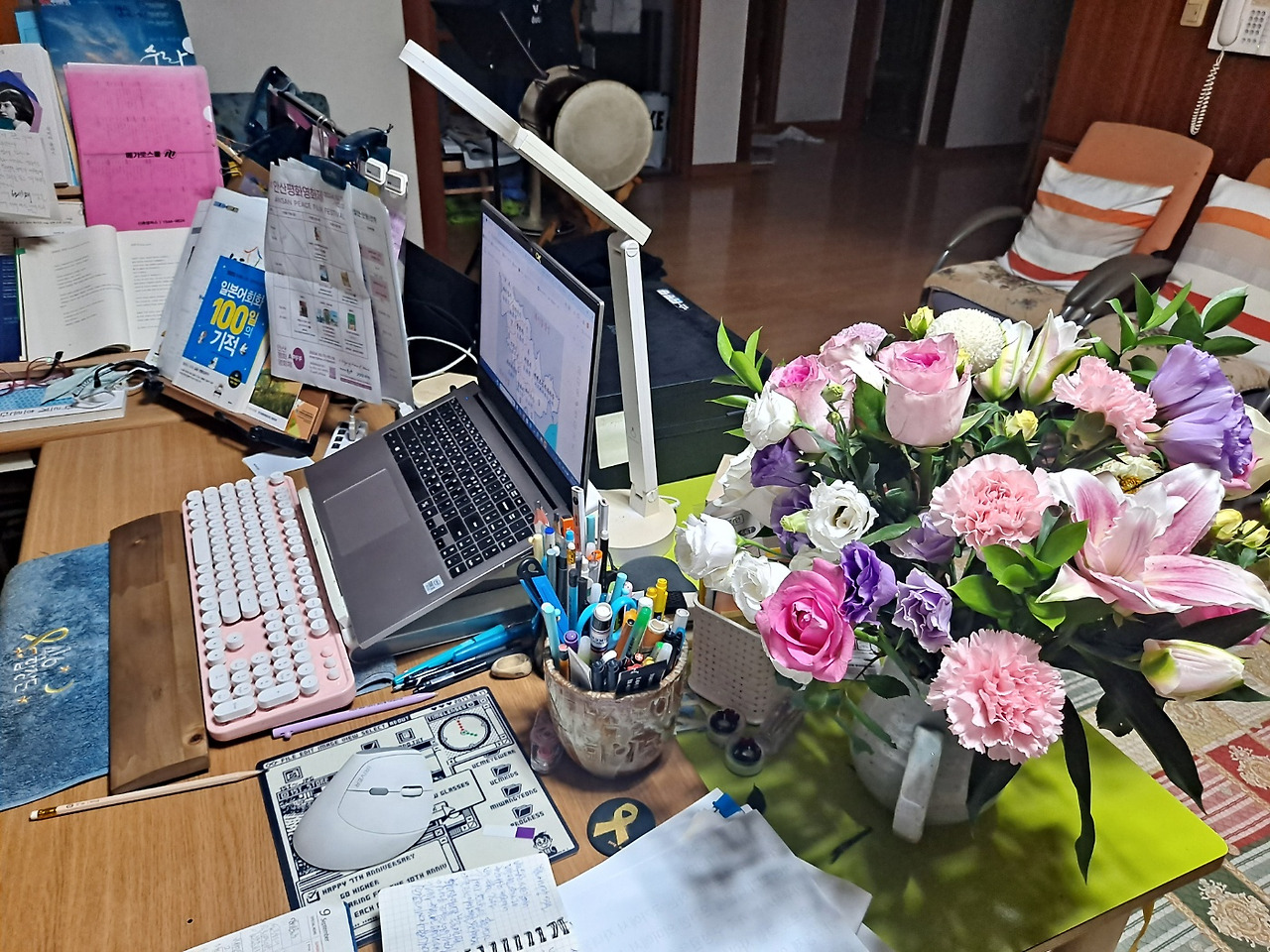 결혼 34주년 기념으로 덕이한테 받은 꽃을 두고 떠난다. 책상 한 켠 꽃병에 꽂혀 한껏 향기를 뿜뿜하고 있는데, 두고 가자니 아쉽다. 기념일 꽃값을 아끼지 않는 덕이다. 여행 떠날 건데 덕이 꽃을 사게 두는 게 맞나 0.1초 고민 안한 건 아니다. 말릴까 하고 말이다. 그러나 아니었다. 꽃이란 그런 것. 살면서 오직 하나의 사치요 찰나를 위해 낭비하는 기쁨이다. 쓸모없음의 쓸모라했다.