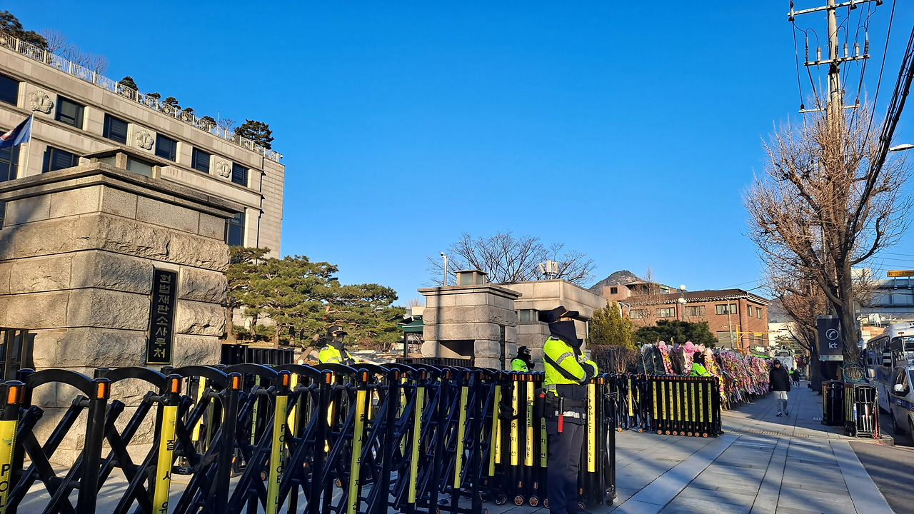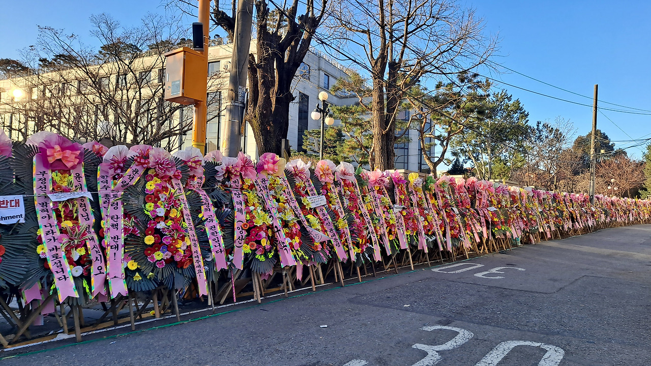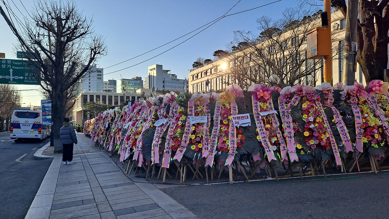 북촌 쪽으로 가다 헌법재판소 앞을 지나는데, 담장이 온통 꽃으로 에워싸인 게 보였다. 뉴스 화면으로만 보던 장면을 실제로 만나니 걸음을 멈출 수밖에 없었다. 윤석열의 탄핵을 반대한다는 사람들이 갖다 놓은 인조 화환이었다. 장례식장이나 결혼식장에 배달되는 사다리처럼 세워진 꽃무더기에 글귀를 적은 리본들이 드리워져 있었다. 꽃이건만 곱게 보이지 않았다. 빈틈 없이 세워진 게 마치 담장에 칭칭 감긴 쇠사슬처럼 보였다.