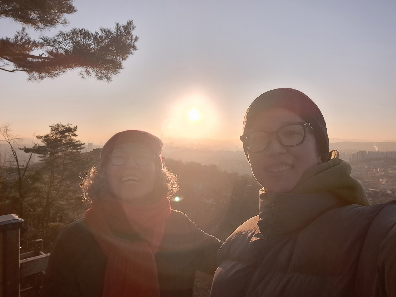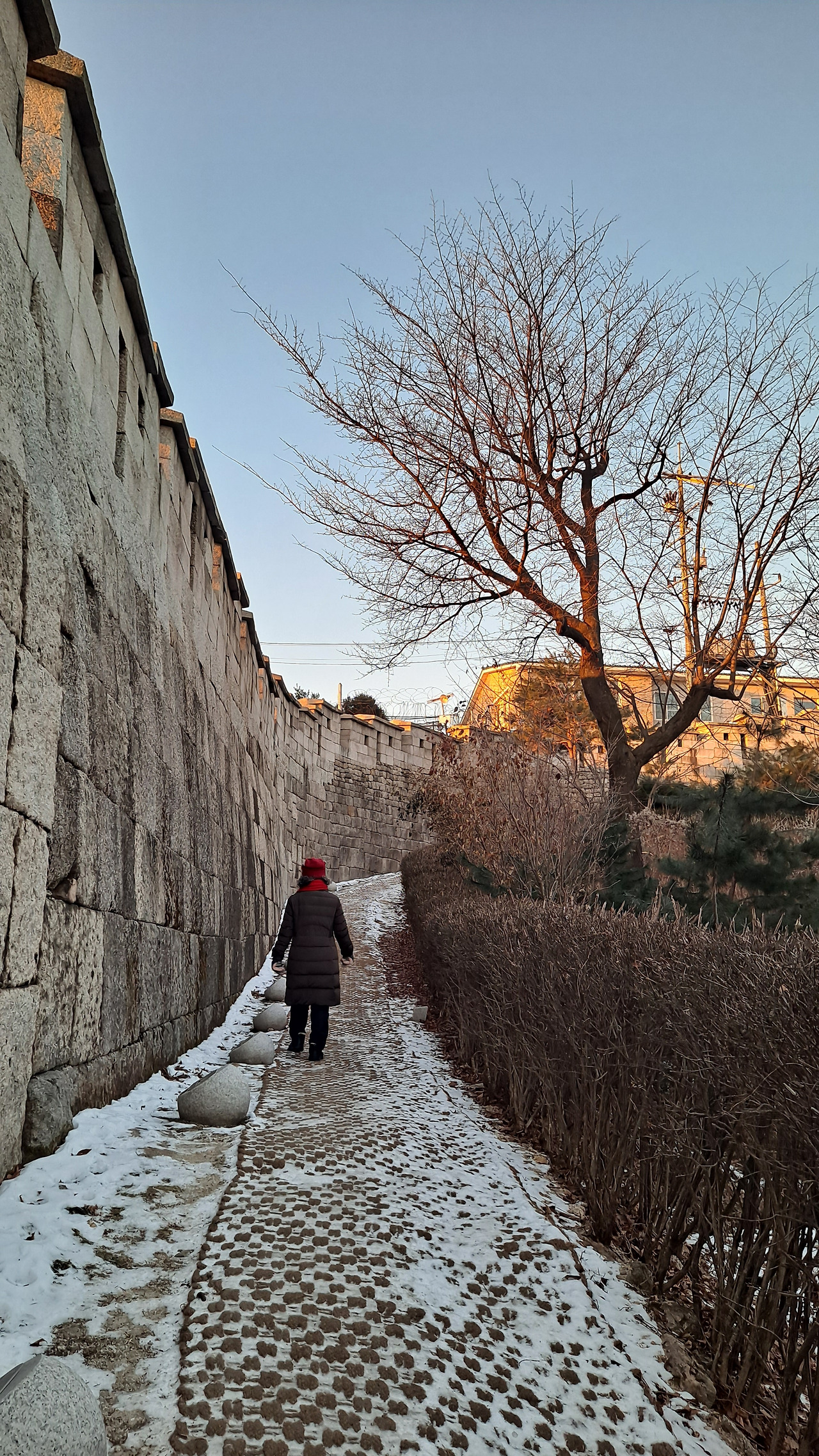 두꺼운 패딩과 모자 장갑 목도리 방한화로 단도리를 하고 와룡공원쪽 성곽길을 올랐다. 우리가 가장 좋아하고 많이 다닌 걷기 코스기도 하다. 하얀 이밥처럼 쌓인 눈을 보며 엄마를 생각했다. 내 마음을 아는 양 아침해가 등 뒤에서 따스한 기운으로 밀어주었다. 성곽의 바깥쪽 계단을 하나하나 밟아 깊은 숨을 쉬며 올랐다. 싸늘하던 몸이 점점 훈훈해지고 땀이 배어났다. 잠시 걸음을 멈추고 가슴을 활짝 열어 아침해를 안았다.