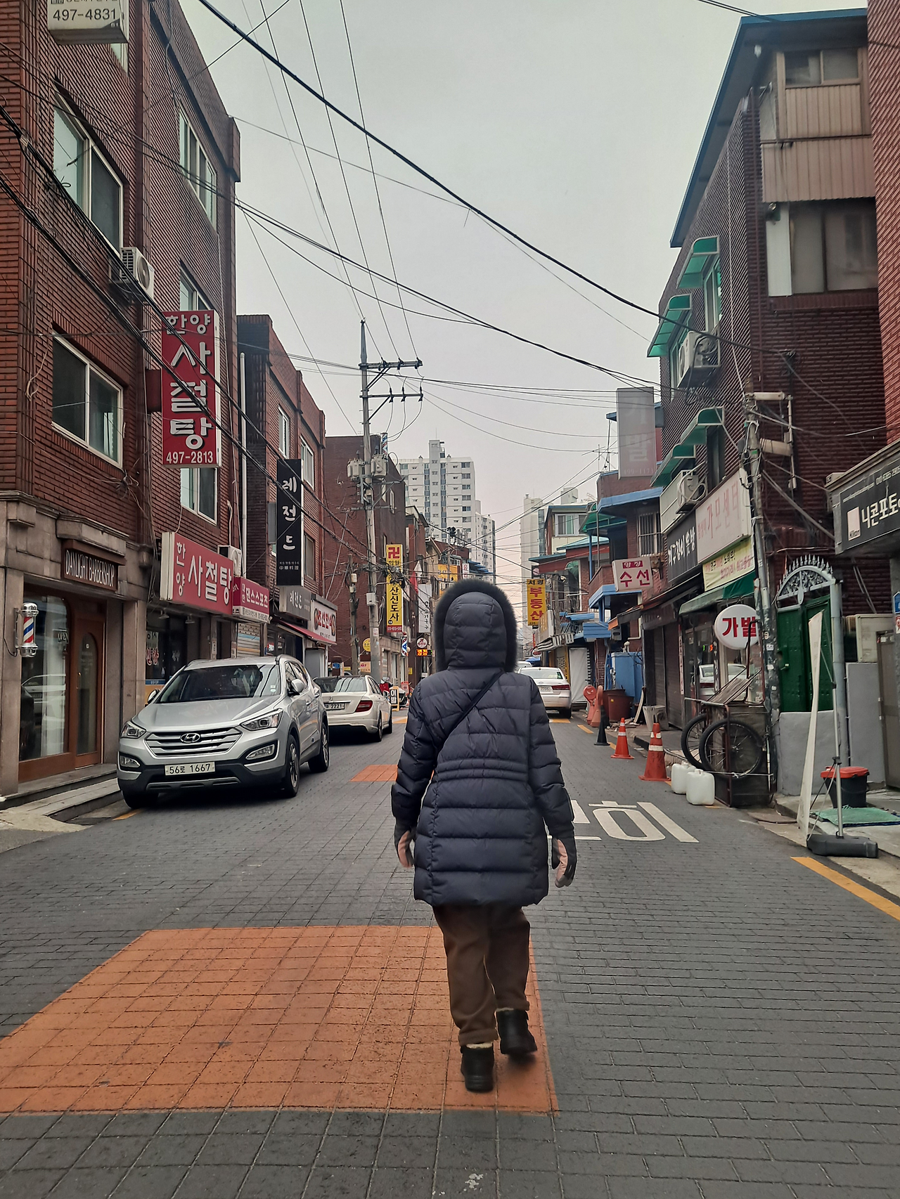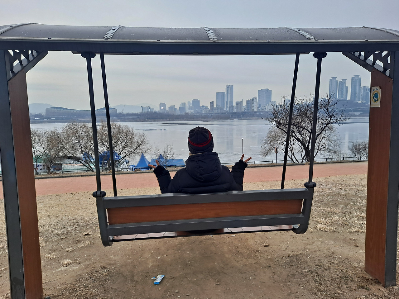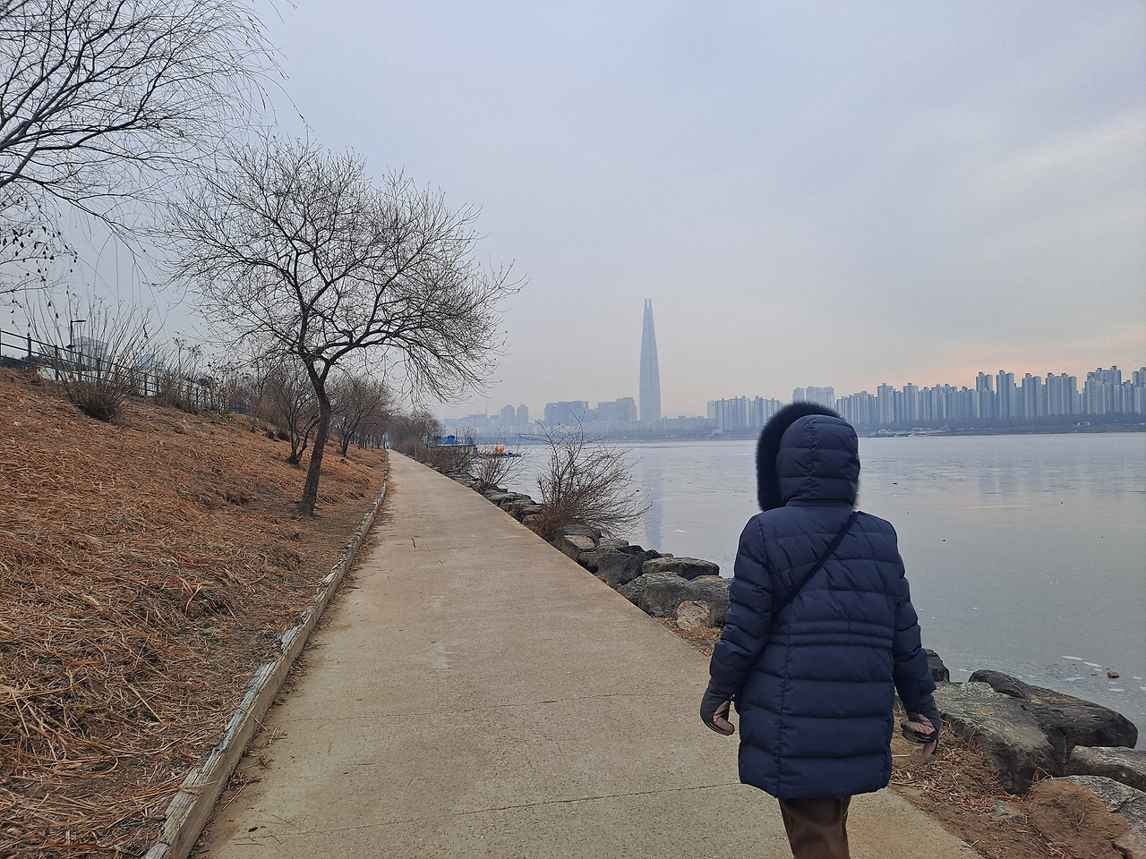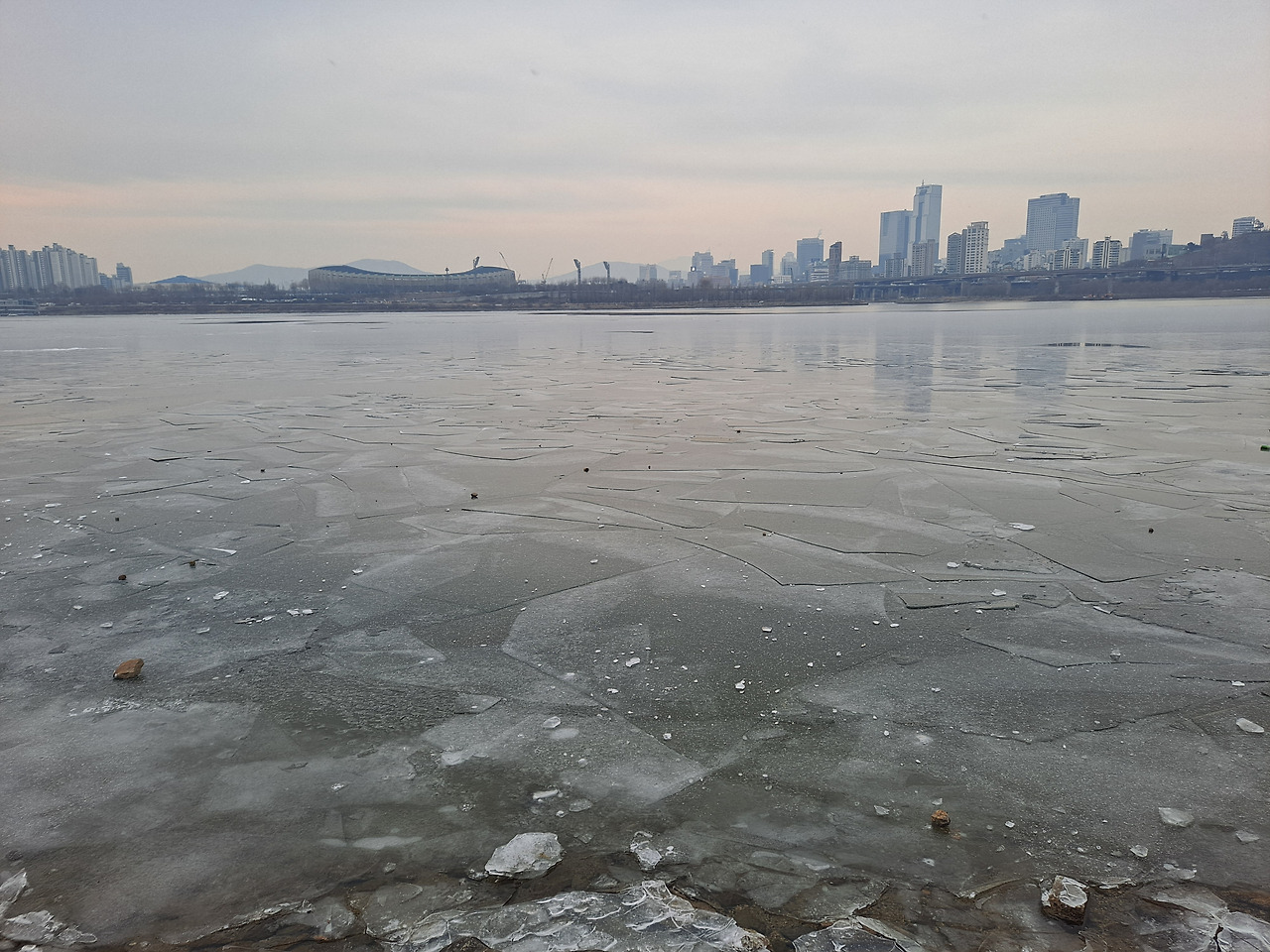 모녀유랑단은 한강을 오른쪽으로 끼고 동쪽으로 계속 걸었다. 겨울 강물도 낯선 얼굴로 말을 걸었다. 꽁꽁 얼었다가 금이 쩍쩍 가며 녹았다가 또다시 얼어붙은 모습이었다. 얼음 깨지는 걸 보고 싶은 사람들이 나 말고도 많았나 보다. 얼음 위에 돌멩이가 뒹굴고 있었고, 가장자리엔 반짝이는 수정얼음도 있었다. 관공선선착장, 119 수난구조대, 한강경찰대 선착장, 방생법당, 장애인 수상스키협회, 수상관광 콜택시 승강장, 아리랑하우스 그리고 생존수영교육장 등을 지나쳐 걸었다.
