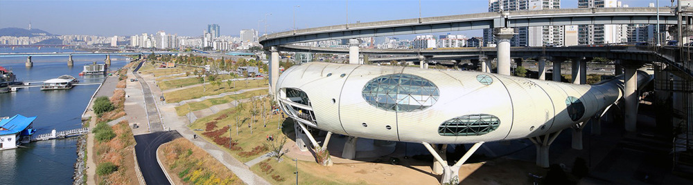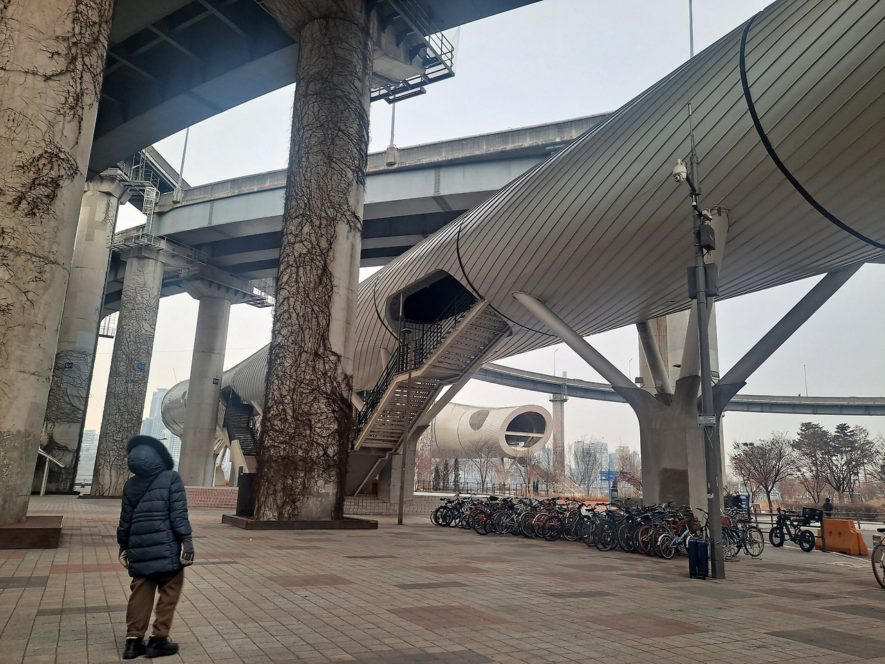 뚝섬한강공원을 향해 걷는 자양동 아침길도 낯설었다. 서울 시내가 맞나 싶게 조용한 동네 아침이었다. 한강에 가까워질수록 더 그랬다. 운동시설이며 수상스포츠 시설이 뚝섬한강공원에 유난히 많이 보였지만 고요했다. 이전부터 이곳이 사람들이 많이 이용하는 유원지란 걸 알 수 있었다. 가장 인상적인 건 벌레처럼 둥글게 구부러지고 고가도로와도 엉켜보이는 구조물이었다. 아래에서 쳐다봐서는 알기 어려웠다.