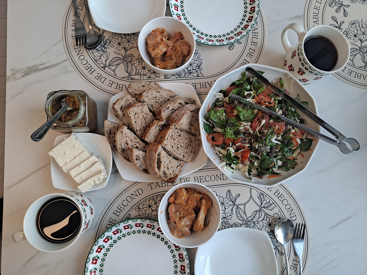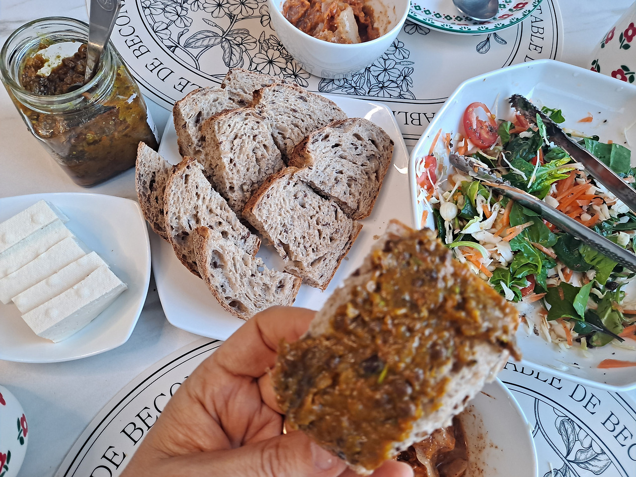 그네에 앉아 잠시 물멍 얼음멍하며 딸은 브이를 보냈다. 다가올 시간을 향한 마음이리라. 돌아오는 길에 산 갓 구운 통밀빵으로 모녀 합숙 첫 점심을 먹었다. 비건 샐러드와 두부 그리고 늙은 호박과 유자청 노루궁둥이버섯환을 허브와 함께 졸인 화숙표 스프레드. 모녀유랑단은 채식자연식 기후미식단이기도 하지. 아, 뚝섬한강공원을 걷고 보니 뚝섬 국말이떡이 자꾸 궁금하다. 흰 팥을 찹쌀떡 양쪽에 두껍게 붙인 떡을 해장국에 말아먹는 뚝섬의 음식이다. 밥이 아니라 떡을 국에 말아? 뚝섬이 나루터였을 때 뱃사공과 노동자들이 한 끼 해결하던 전통 음식이란다. 아~ 이 호기심, 가난하던 시절의 전통음식이니 설마 육식 해장국은 아니겠지?