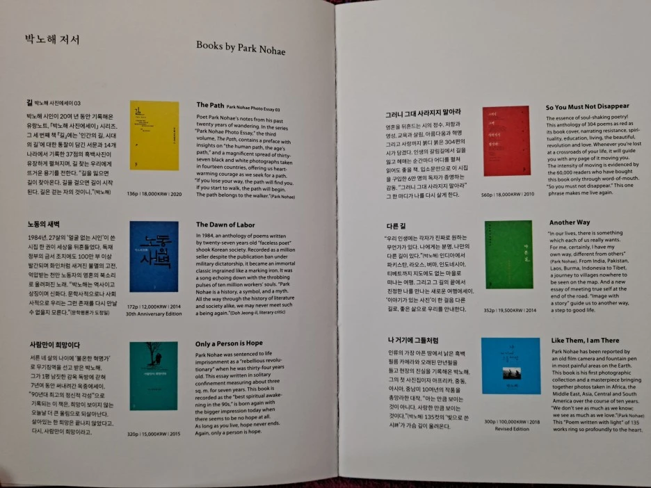 나눔 문화에서 운영하는 <라 카페 갤러리>에서 상설 전시하고 있는 박노해 사진전이 현재 18번째까지 이어지고 있다. 총 30만 관객이 다녀갔다니, 그 숫자엔 나도 있겠다. <하루>, <단순하게 단아하게>, 그리고 <길>을 전시회로 보고, 책으로 읽은 독자에겐 시 그림책이 또 하나의 시화 전시가 될 것이다.