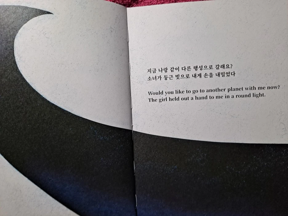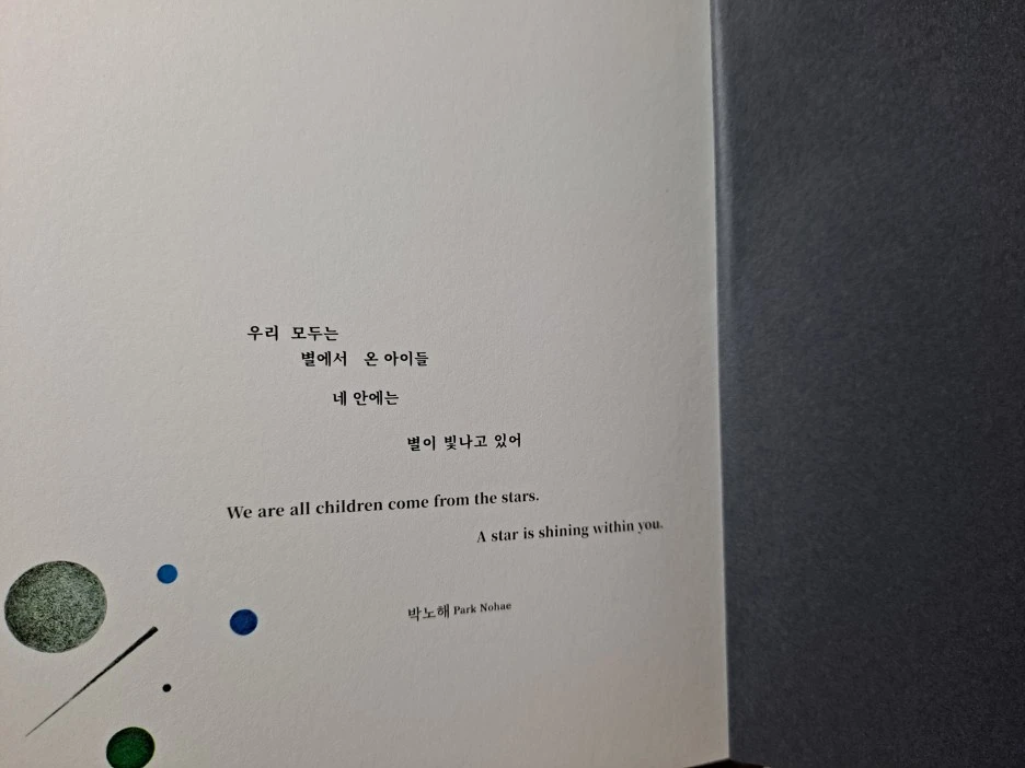 책 뒤표지 바로 앞장은 까만 여백. 아마도 우리가 바라볼 까만 밤하늘이 아닐까. 어두운 하늘일수록 별이 잘 보이니까. 그 앞 왼쪽 페이지엔 추상적인 무채색 동그라미들과 작대기와 시인의 에필로그가 있다. 거기서 너의 별을 보고, 내 별을 보고, 내 안에 빛나는 별을 볼 수 있다. 까만 밤하늘의 공간과 시간을 허락하는 책. 참 잘 만든 시 그림책이다.