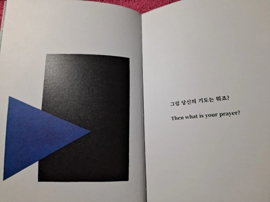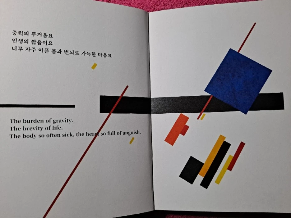 이렇게 글이 없는 여백의 면은 책 속에 여러 번 나온다. 푸른빛의 소녀가 묻고 시인이 대답하는 중간중간, 마치 쉬어가듯 숨 쉬는 공간이겠다. 소녀가 다른 질문을 하기 전에 숨을 돌리겠고 시인이 생각을 정리하는 시간이겠다. 생각의 숲 속 같고 깊은 강물 같은 공간인가 하면, 바다 같은 심연의 기간이기도 하다. 푸른 하늘이고 우주같이 넓고 끝없는 공간, 푸른빛의 끝없는 시간, 원색의 빛나는 그림이 있을 뿐이다. 시와 그림이 독자에게 말을 걸고 거니는 시간과 공간이다.