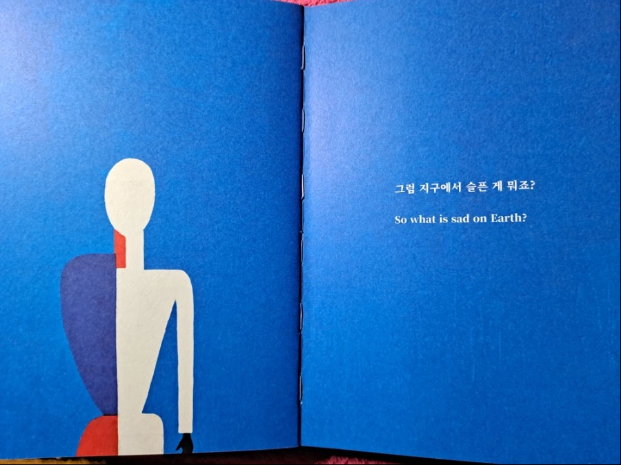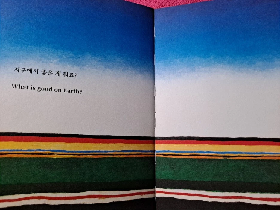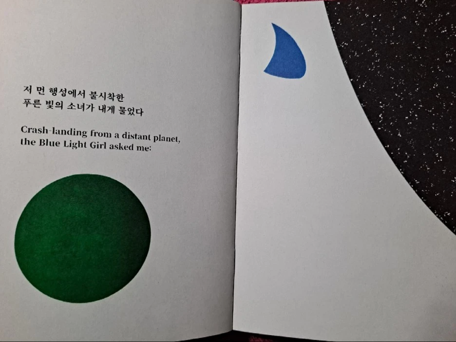 시 그림책을 여는 첫 질문이다. 저 먼 행성에서 불시착한 푸른빛의 소녀가 지구 시인에게 하는 첫마디가 "지구에서 좋은 게 뭐죠?" 질문이다. 지구 말고 더 좋은 곳이 있다면 떠나자는 제안일까? 지구에서 좋은 게 얼마나 많은지 생각하라는 걸까? 금방 대답할 말이 생각날까? 시는 푸른빛의 소녀가 던지는 이런 질문과 시인의 목소리로 이어지고 또 이어진다.