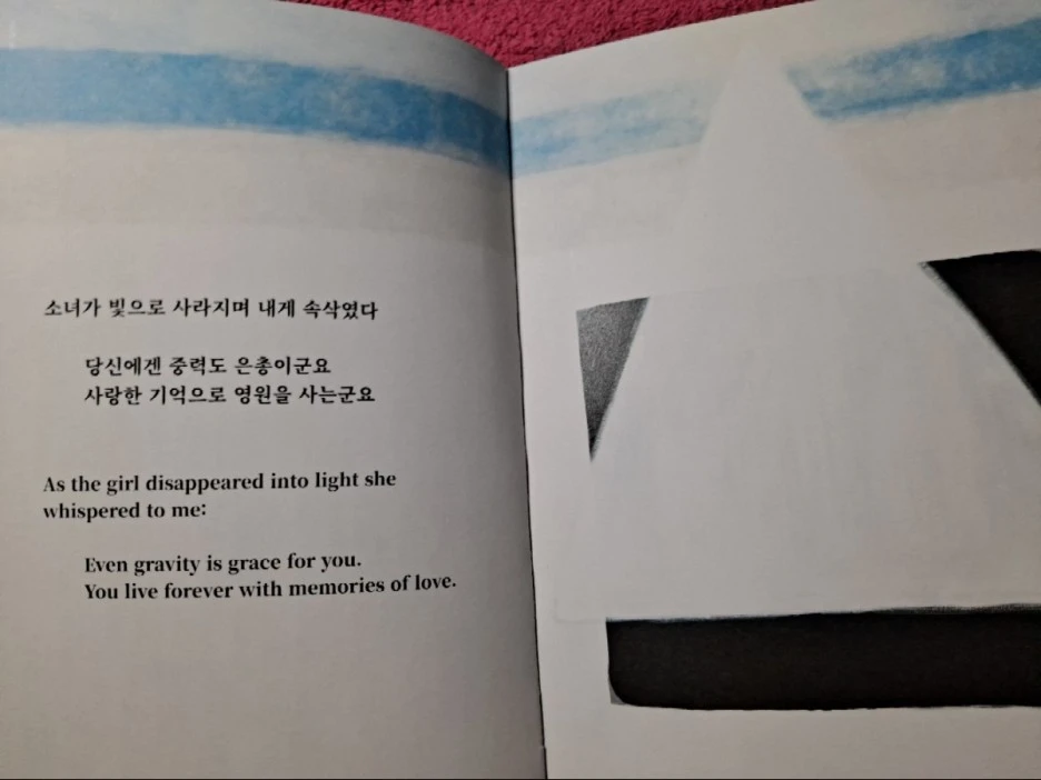 푸른빛의 소녀가. 시와 그림들이, 이렇게 만나고 이렇게 어우러질 수 있구나. 이런 신비로운 그림을 그린 사람은 누구지? 시 그림책을 읽어 나갈수록 시인이 선택한 그림이 자꾸만 말을 걸어올 것이다. 이 추상화 뒤에서 말하는 작가가 궁금해 참기 어려워질 것이다. 이 시를 이런 그림으로 담아낸 주인공을 만나 말을 걸어볼 수 있을까? 시 그림책을 그린 화가 이야기부터 하지 않을 수 없겠다.