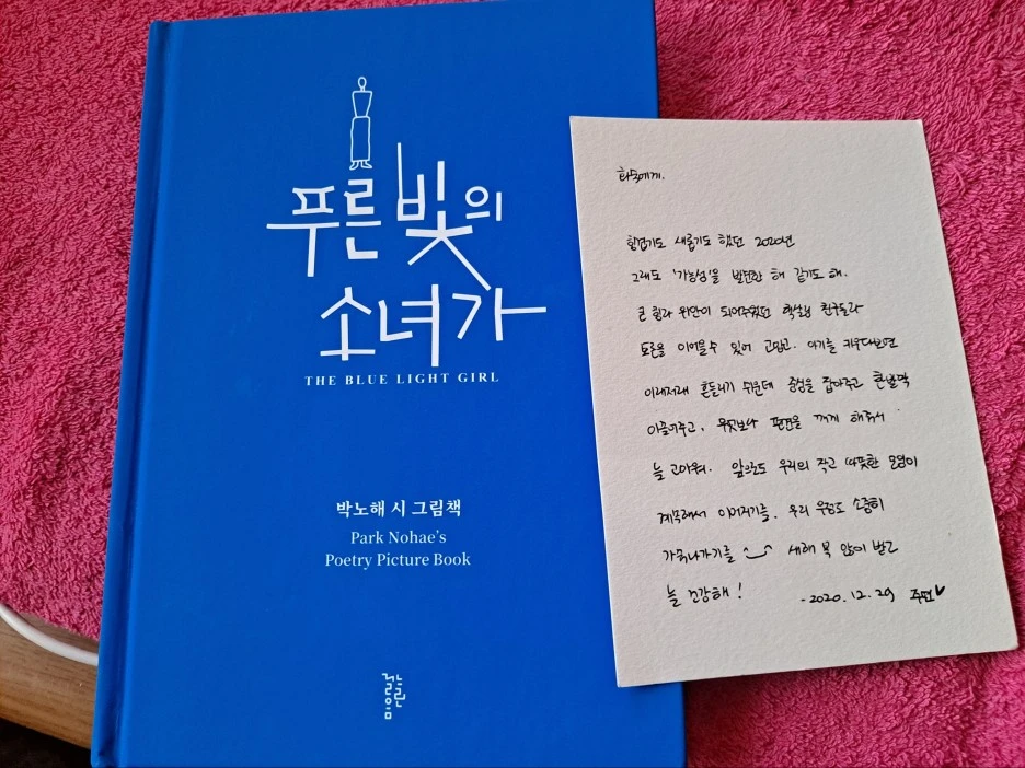 우리는 한살림 마을 모임 '책살림'에서 책 읽고 토론하는 사람들. 나이와 경험, 지금 사는 모습도 조금씩 다르지만, 서로 이름 부르고 평어 쓰는 친구들이다. 세상에 많지 않은 관계겠다. <푸른빛의 소녀가>를 받고 포장을 뜯었을 때, 내 이름을 부르는 엽서가 나왔다. 손글씨로 쓴 글을 소리 내 읽다가 나는 울컥, 눈물을 흘리고 말았다. "나를 울린 친구야!" 수다로 답했다.