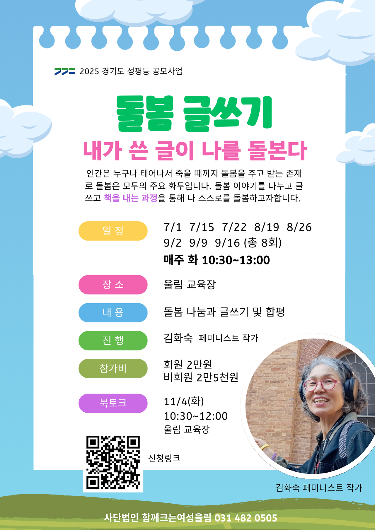 안산의 여성단체 '함께크는여성울림'이 '돌봄 글쓰기' 프로젝트로 '2025 경기도 성평등 공모사업'에 선정되었고, 내가 글쓰기 강사로 참여하게 되었다. 전체 강좌 기간으로나 참여 인원으로나 예산으로나 규모가 있는 강좌다. 전문가 교수 3명의 강의를 포함해, 내가 글쓰기 8주에 영화 토론 2회 진행하게 된다. 참여자들과 글을 합평하고 고쳐쓰고 책을 묶고 북토크까지 하면 전체 일정이 끝난다.