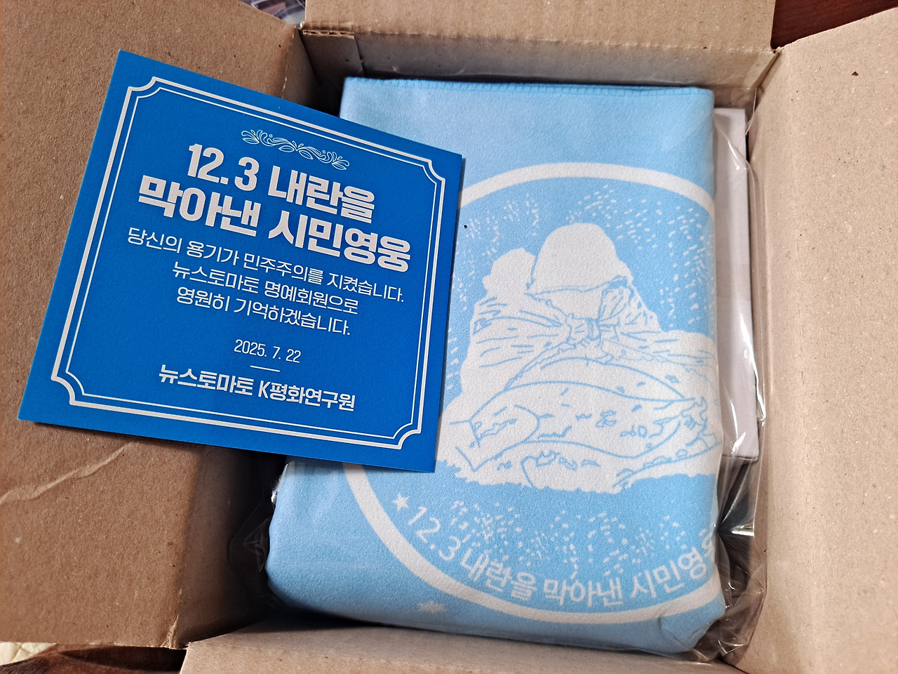 뉴스토마토가 보낸 묵직한 금속 메달의 한 면에 새겨진 문구다. '내란을 막아낸 시민영웅'이란 호칭도 쑥스러운데 "당신의 용기가 민주주의를 지켰다"라니 쪼메 부끄럽다 해얄지 오글거린다 해얄지 표현이 망설여진다. "12.3 내란을 막아낸 시민영웅"이란 문구와 은박지를 뒤집어 쓰고 눈밭에 앉은 키세스 시민 이미지와 내 이름 석자가 또렷이 새겨져 있다. 과분한 걸 알지만 받았다. 역사의 순간이 영광스럽고 자랑스럽다. 하늘색 배너도 같은 목소리다. 포장에 든 파란 쪽지도 그런다. "뉴스토마토 명예회원으로 영원히 기억하겠습니다." 가문의 영광이 아닐 수 없다.