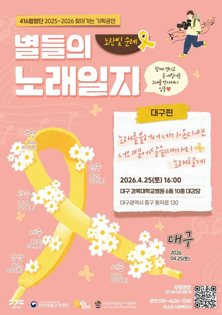그러나 합창단에 관해 오늘 진짜 하고 싶은 이야기는 지금부터다. 찾아가는 기획공연 대구 편 홍보를 하려 한다. 4월 25일 오후 4시, 대구 경북대학교병원 6동 10층 대강당에서. 2주 앞으로 다가왔다. 4월이 어떤 달인가? 세월호 참사 12주기가 든 달이라 이미 이달만 공연이 3번이나 있었고 앞으로 남은 공연 역시 3개가 있다.