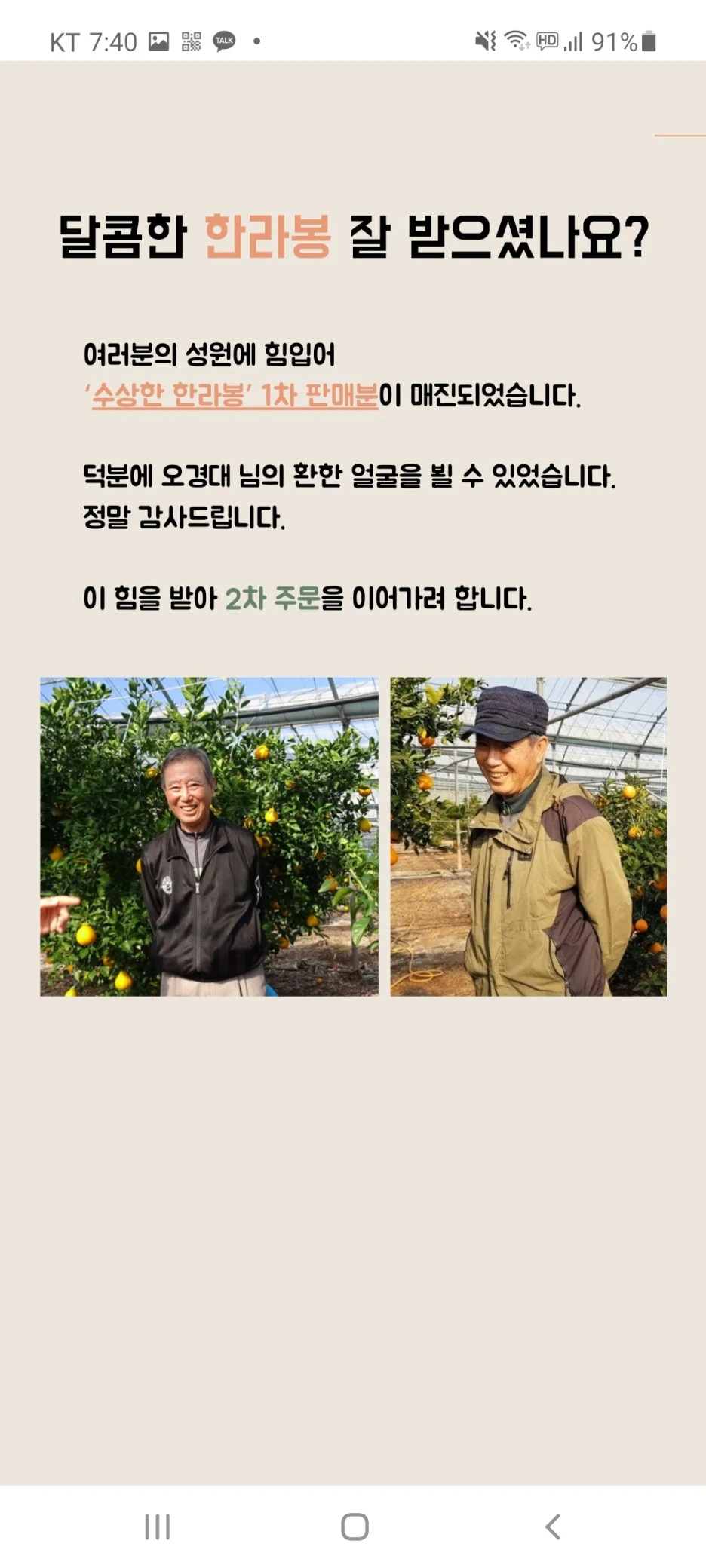 여러분의 성원에 힘입어 ‘수상한 한라봉’ 1차 판매분이 매진되었습니다. 덕분에 오경대 님의 환한 얼굴을 뵐 수 있었습니다. 정말 감사드립니다. 이 힘을 받아 2차 주문을 이어가려 합니다.