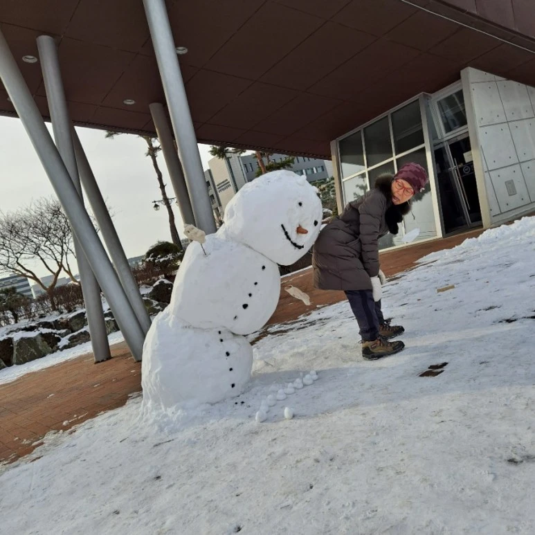 우리 동네란 한양대학교 정문 앞이랍니다. 거기 누군가 만들어 놓은 눈사람이 있더군요. 키 크고 잘 생긴 눈사람인데 옆으로 많이 기울고 있었어요. 그 모습이 참 인상적이었어요. 인사를 하는지 말을 거는지. 이제 곧 사라질 거라고 아쉬워하는 모습인지. 하여간 우리를 붙들어 세우더군요. 중년의 우리가 눈사람 만들고 놀 일 있겠어요? 그렇다고 손자 놀아주는 때도 아니고 말이죠. 눈사람을 만든 기억도 가까이 본 기억도 모두 가물가물하더군요. 아직 10시 전 아침이었어요. 아침 해가 눈사람 뒤로 비쳐 올라오는 게 보였어요. 더 포근해지면 기울어진 눈사람은 더 녹아 사라지고 말겠더군요. 우리 또래 친구를 만난 양 눈사람하고 같이 놀았지 뭡니까. 같이 사진 찍고 말도 걸고, 수다를 떨었죠. 앞으로도 보고 옆으로 보고, 안아 주기도 하고요. 어떤 아침은 이렇게 흘러가기도 한다니까요? 내일 아침에 꼭 다시 가 봐야겠어요. 눈사람이 사라지고 없으면 섭섭할 거 같아요.