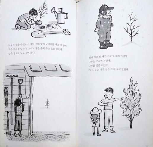 이 그림책은 봄, 여름, 가을, 겨울이 순차적으로 그려지지는 않았다. 봄이 등장했다가 가을이 등장하고, 다시 봄 풍경처럼 보이다가 여름 풍경이 보인다. 그리고 눈보라가 치는 겨울이 등장한다. 그리고 마지막에 나무를 심고 가꾸는 아이들의 모습이 네 개의 작은 그림으로 등장한다.
