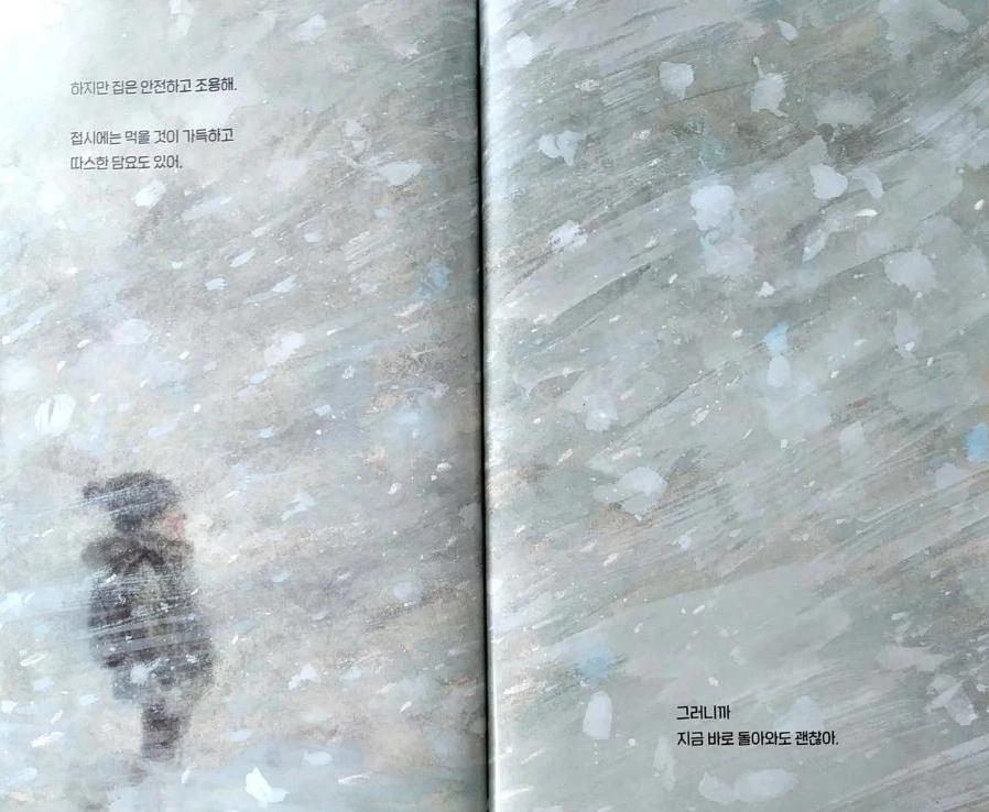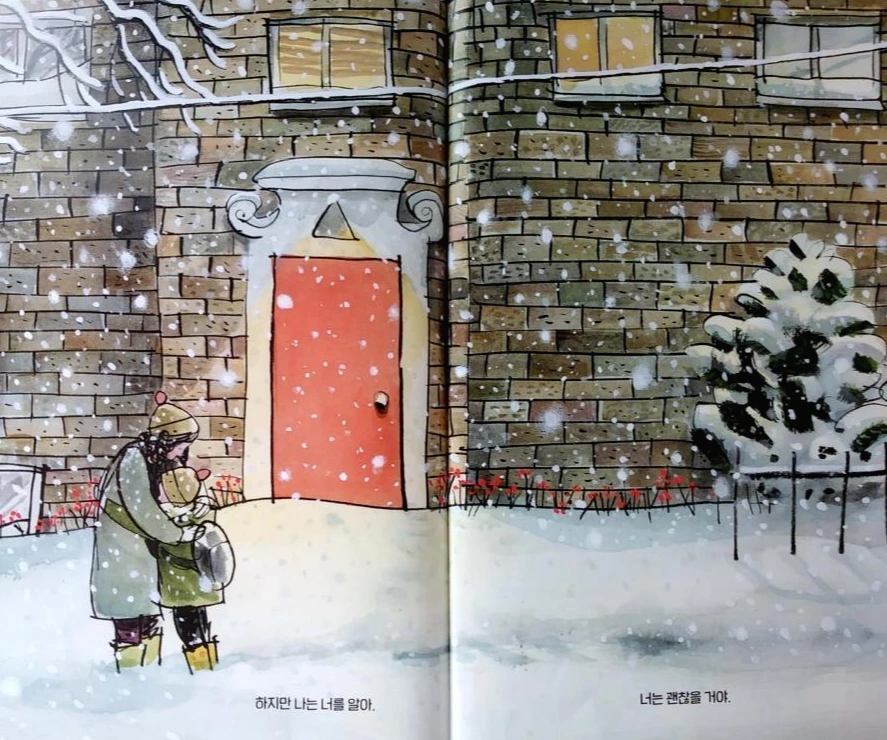 이 그림책의 백미는 마지막 장면에 있는 것 같다. 빨간 열매인지 꽃인지 알 수 없는 나뭇가지가 있는 눈길 위에 고양이가 발자국이 보인다. 헌사 페이지에 등장했던 꽃이고, 엄마와 포옹하는 장면 뒤에 보이는 꽃이다. 헌사 페이지 그림은 마치 소년의 집 탁자 위에 있는 것 같다. 고양이의 발자국을 통해 고양이가 소년의 집으로 안전하게 돌아오고 있을 것만 같다. 아니 어쩌면 이미 도착해서 따듯한 방안에서 소년과 즐거운 한때를 보내고 있지는 않을까....