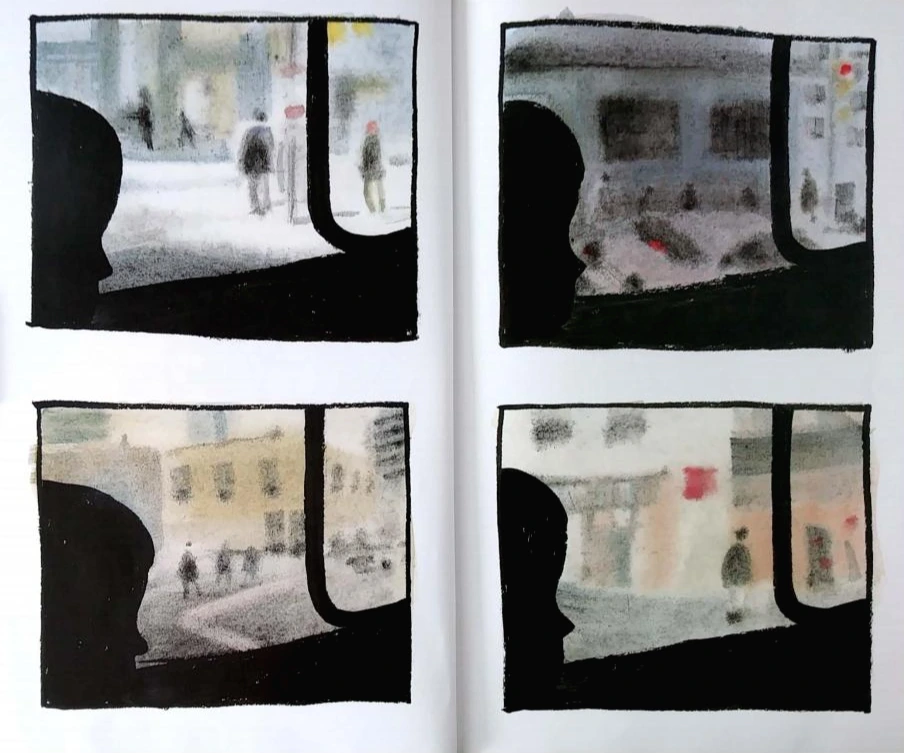 버스에서 내린 소년은 골목길 이곳저곳을 지나간다. 첫 번째 펼침면에서는 네 개의 프레임으로 비슷한 그림이 보인다. 아이가 창밖으로 보는 모습인데, 아이와 버스 형태는 검은 먹색으로 그림자처럼 그려졌다. 밖은 마치 아웃포커싱 되듯 희미하게 그려졌다. 바깥의 풍경은 네 개의 프레임이 각각 다르다. 버스가 어디론가 계속 이동하고 있다는 것을 알려주고, 아이는 계속 바깥을 주시하고 있다는 것을 알 수 있다.