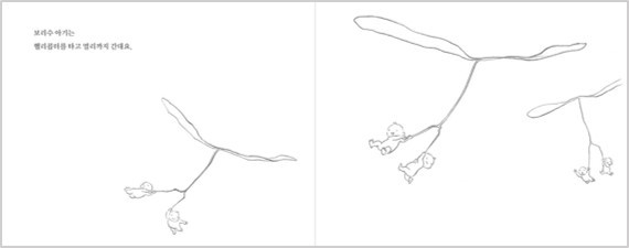 책 제목이 [나무의 아기들]이다. 바로 씨앗과 열매 이야기이다. 나는 몇 년 동안 수목원에서 숲해설을 했기 때문에 이 책을 처음 보았을 때, 분노와 안타까움이 먼저 들었다. 책에 문제가 있어서? 책의 내용이 부족하거나 잘못되었기 때문에 이런 감정이 든 게 아니다. 그토록 숲을 다니면서 줄곧 보았는데 나는 왜 이런 책을 만들 생각을 못했을까 하는 나 자신에 대한 분노와 안타까움이었다. 작가가 얼마나 자주 숲을 다니며 나무와 열매를 관찰했을지, 열매들의 모양과 움직임을 아기들의 몸짓에 적용하기까지 얼마나 많은 시간과 노력이 들어갔을지 짐작할 수 있었다.
