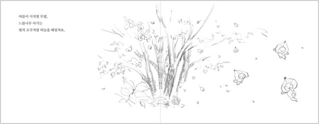 다음 그림에서는 금빛 머리칼로 묘사한 무궁화 씨앗 아기가 콘서트를 여는 장면으로 연결된다. 그리고 앞에서의 흑백 그림에서 갑자기 컬러가 들어간 그림이 등장한다.