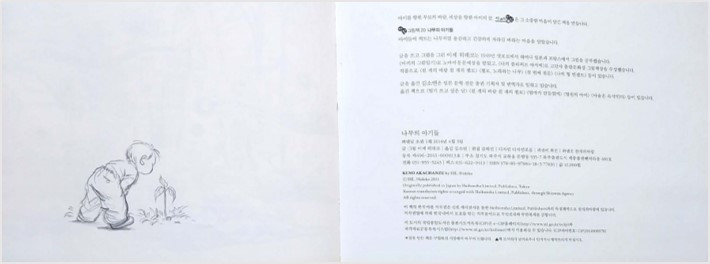 면지는 흰색 바탕에 얼레지처럼 보이는 꽃잎과 나뭇잎을 들고 가는 아기들이 보인다. 나무의 구성원인 꽃과 잎을 보여주고 있다. 또한 그림은 오른쪽 아래 구석에 그려 자연스럽게 [페이지터너] 기능을 하게 만든다. 다들 영화나 드라마, 또는 콘서트 장에서 피아노를 치는 연주자 옆에서 대신 악보를 넘겨주는 사람을 본 적이 있을 것이다. 바로 이런 [페이지 터너] 기능이 그림책에도 존재한다. 책을 읽는 독자의 시선은 우리나라의 경우 자연스럽게 왼쪽에서 오른쪽으로 움직인다. 또한 위에서 아래로 내려온다. 그렇기에 오른쪽 하단에 독자들이 다음 페이지로 넘어가도록 유도하는 것이 중요하다. 그러니 우리는 이 면지 그림을 보면서 귀여운 아이들의 몸짓에 살짝 미소를 지으며 재빨리 뒷이야기가 궁금해서 페이지를 넘기게 된다.
