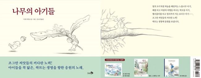 이 그림책은 씨앗과 열매라는 딱딱하고 건조한 정보 이야기를 시적인 글과 환상적인 그림으로 제대로 풀어냈다. 표지를 살펴보면 나무의 아기들 제목 아래에 도토리 열매 아기들이 보인다. 하나는 나뭇잎을 단 도토리 가지 하나를 들고 가는 도토리 열매 아기이고 하나는 도토리 열매 모자에서 떨어지고 있는 아기의 모습이다. 그리고 뒷면지에는 나무에서 기생하며 사는 겨우살이 아기의 모습이다.
