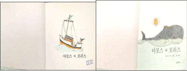 다음장에는 뜻밖에 일이 일어난다. 아모스가 고래와 밤하늘의 무수한 별들에 감탄하다가 아름다움과 신비함에 취해서 그만 데굴데굴 구르다가 바다로 빠지고 말았다.