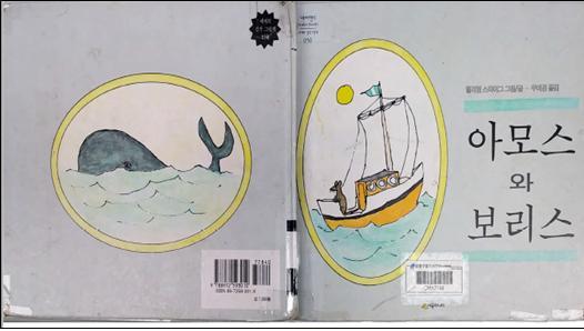 윌리엄 스타이그의 그림책 [아모스와 보리스]를 만나 보자. 표지를 살펴보자. 어떤 이야기일 것 같은가. 쥐와 고래 둘의 이름이 아모스와 보리스일 테지. 앞표지에는 쥐가 배를 타고 있고, 뒤표지에는 고래가 보인다. 그림들은 모두 노란색 원형틀에 들어가 있다. 표지 그림과 제목, 제목 위, 아래에 있는 선으로 디자인이 조금 산만해 보인다.