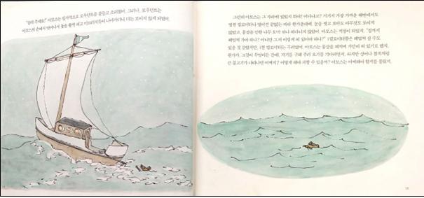배는 떠나가고, 아모스는 아무것도 보이지 않는 바다 한가운데서 어찌해야 할지 몰랐다. 앞 장면과 이 장면에서는 글과 그림을 분리해서 보여준다. 그림을 네모와 원형 틀에 넣고 글과 분리했다.
