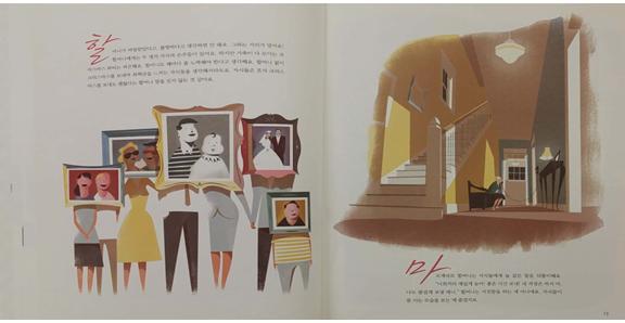 할머니는 자신의 기억이 장난을 쳐서 이제 크리스마스를 혼자 보내기로 결심한다. 할머니가 가족들에게 버림받거나 할머니가 가족을 싫어해서가 아니다. 할머니는 스스로 혼자 크리스마스를 보내도 괜찮다고 생각하는 것이다. 나는 이 글을 설명한 그림을 보자, 이 그림책을 눈여겨 보기 시작했다. 가족을 보여주는 장면에서 액자를 이용하여 그림을 그린 부분이 독특하고 눈에 띄었다.