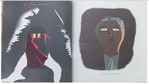 이 책은 본문이 꽤 긴 그림책이다. 첫 번째와 두 번째 펼침면에는 할머니의 동네 모습과 동네 사람들이 모습이 보인다. 그리고 세 번째 펼침면에서 글과 그림이 함께 보인다. 외부에서 보는 마르게리트 할머니의 집과 내부에서 밖으로 보는 할머니의 대조를 이루며 한 페이지에 그려지고 있다.