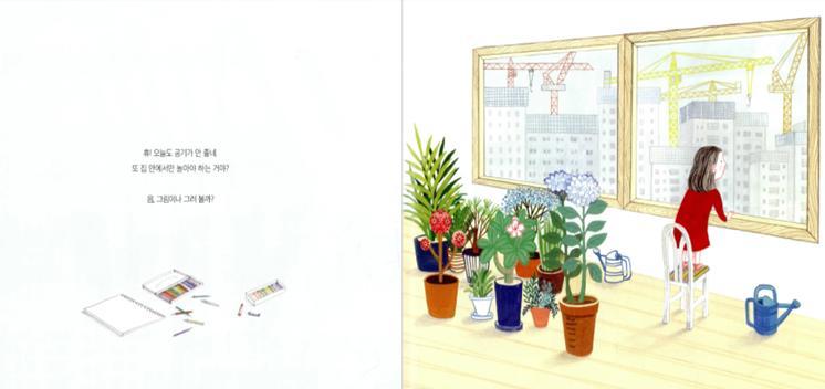 글을 읽고 다시 그림을 보니 밖이 미세먼지가 가득한 뿌였다는 사실이 이제 보인다. 그리고 아이의 방에 많은 식물 화분이 놓인 이유도 알 수 있게 된다. 이렇듯 그림책은 글과 그림을 오가면 여러 차례 읽을수록 많은 것들을 제대로 볼 수 있다. 성인과 같이 글에 익숙한 독자라면 더욱 그렇다. 그림을 먼저 읽고 글을 나중에 읽어야만 더욱 그림을 꼼꼼히 볼 수 있는데, 이미 문자 학습에 길들여지면 나이를 떠나 그림보다는 글만 읽게 된다.