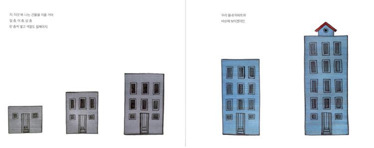 나는 개인적으로 이 그림책의 그림 형태와 색감을 선호하지 않는다. 빌딩이어서 그림의 한계가 있었겠지만 형태가 너무 인공적인 냄새가 가득하고, 그림책을 가득 채운 직선이 답답함을 일으켰다. 원색에 가까운 색상과 빨강, 파랑, 노랑의 색상이 주를 이루고, 채도가 낮아 탁해 보이는 그림이라 나의 취향과는 맞지 않았다.