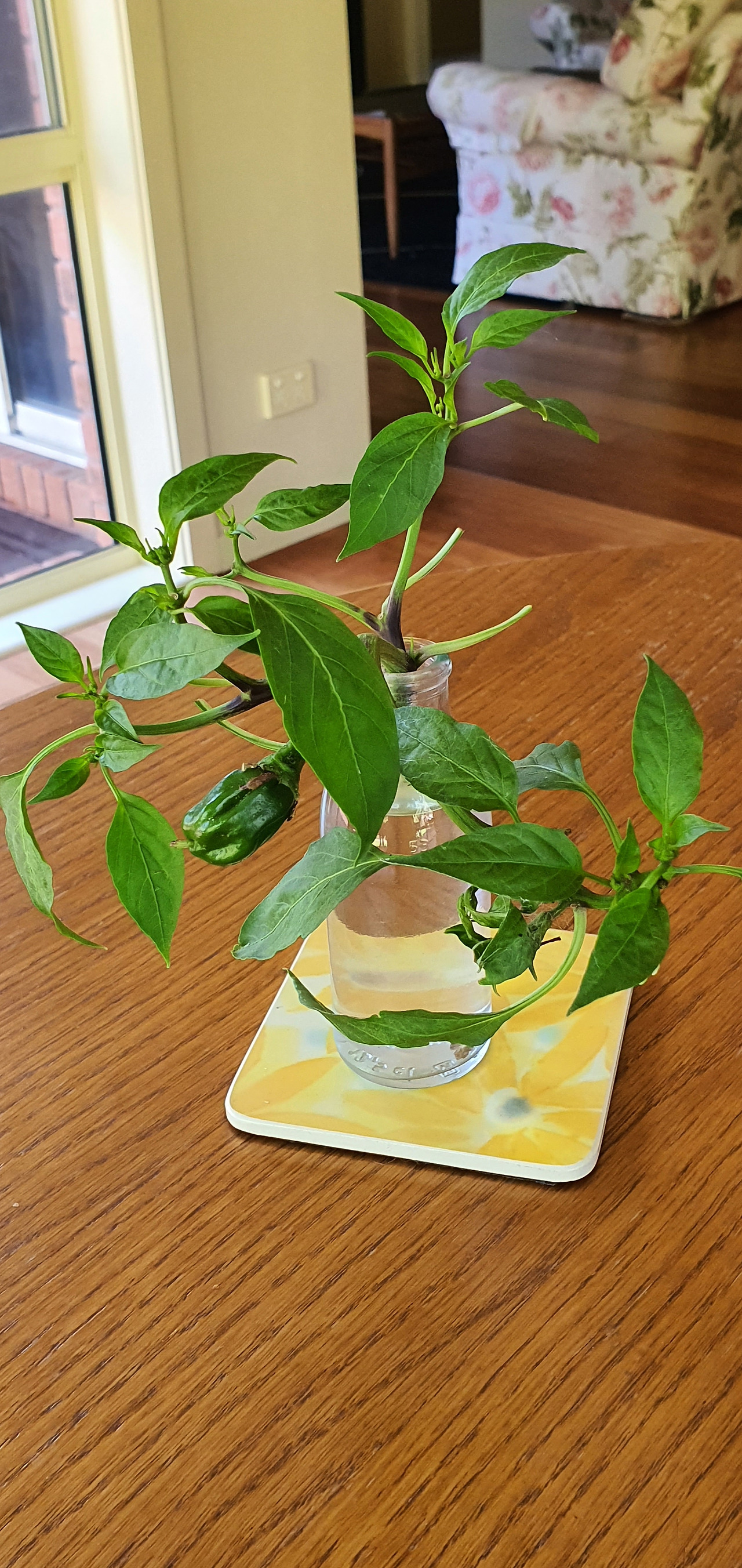 미니 텃밭에서 끼니마다 조금씩 수확하는 즐거움을 누리고 있다. 파아슬리 파 깻잎 고추 고춧잎 근대.. 뒷마당의 닭들이 나은 계란도 매일 두 세알씩 주워 온다. (사진 속의 닭은 우리 집 닭은 아니고 친구네 집에 놀라가서 찍은 거다. 검은 깃털이 보드랍고 외모도 독특한데 이름은 실키.^^) 부러져 메마른 고추 가지를 버릴까 하다 들여와 물병에 꽂았더니 신기하게도 잎이 살아나고 열매도 자랐다. 최근 보았던 소년 심판 드라마가 생각나서 시로 지어 보았다.