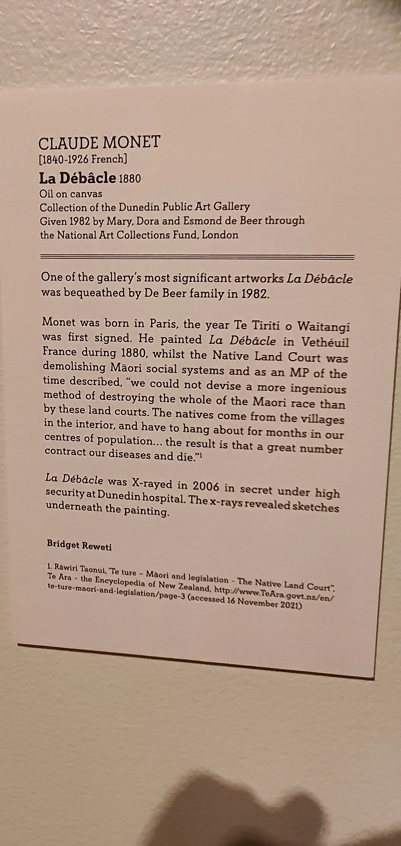 그렇게 걷다가 들어간 동네 미술관에선 뜬금없이 어느 수집가가 기부했다는 모네의 그림도 발견했다. 이 그림이 그려진 시대 뉴질랜드의 마오리족 원주민들이 이주자들이 전파한 질병들로 인해 죽어갔다는 역사도 같이 적어놓았다.