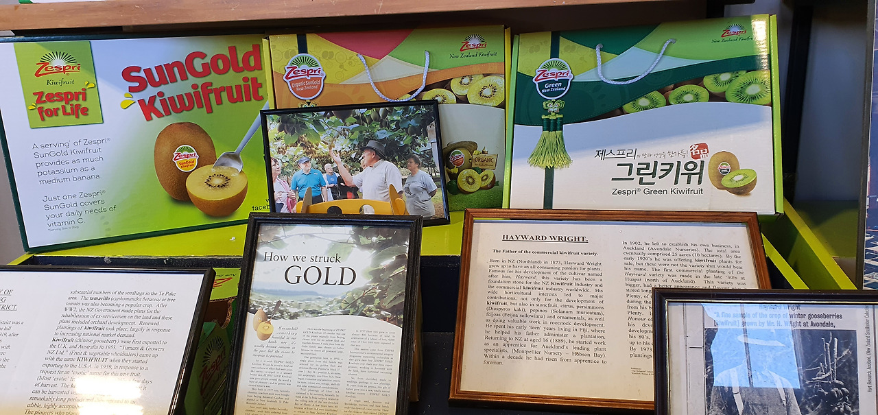 근처 마을회관에 들러 키위도 맛보고 키위 주스와 스콘도 먹었다. 키위로 만든 사탕이나 잼 와인 주스 등등을 판매했다. 키위 이미지로 만든 키위 농장 본사 건물.