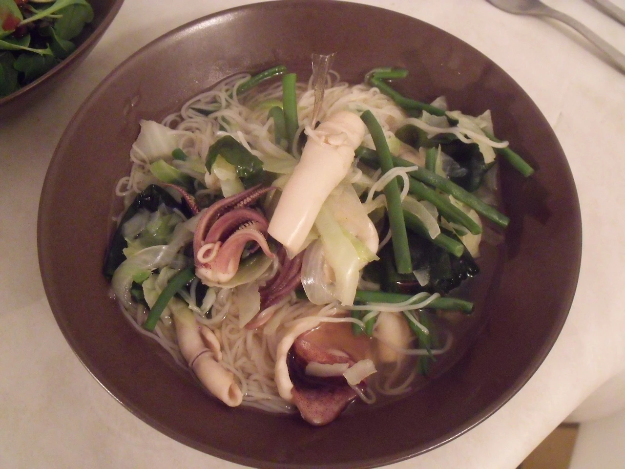 오징어와 프랑스산 앏은 콩깍지를 잔뜩 넣은 소면 국수. 소면은 런던에서 이삿짐 꾸리던 이름모를 일본 유학생에게서 얻었다.