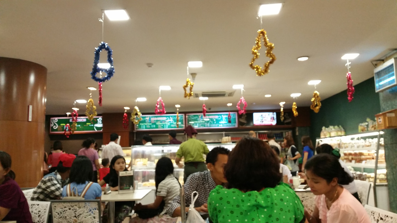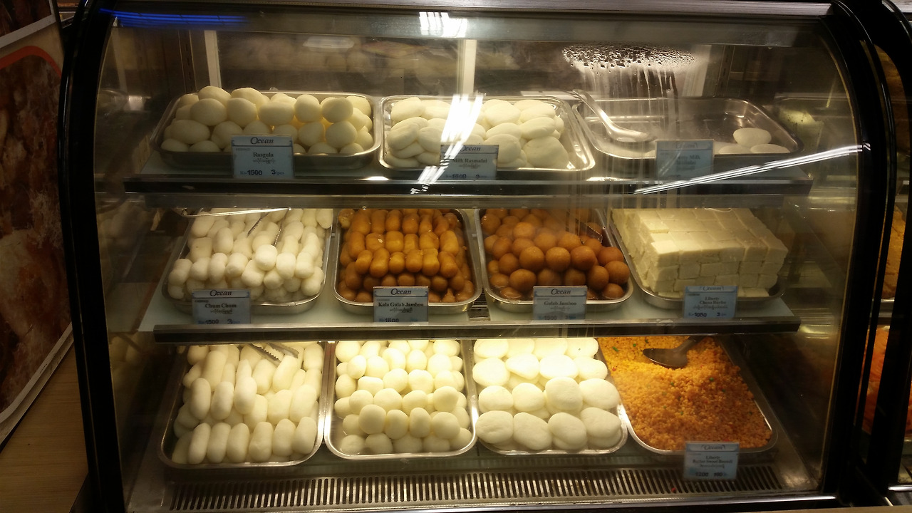 좀 괜챦타는 쇼핑센터도 가봤다. 한국 동네 마트 수준. 그곳 음식점에 진열된 미얀마 디저트들.