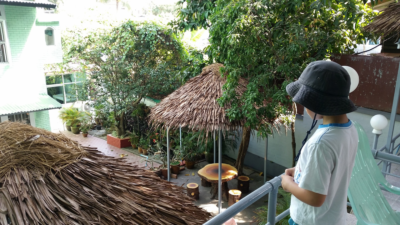 공항에서 그리 멀지 않았던 루비호텔. 일박 3만 5천 원. 컨티넨탈 조식 포함.(식빵에 잼 발라 커피랑 먹는 간단한 서양식 아침) 3층쯤 되는 건물 마당엔 토속적 초가지붕으로 만든 그늘막도 있었다.