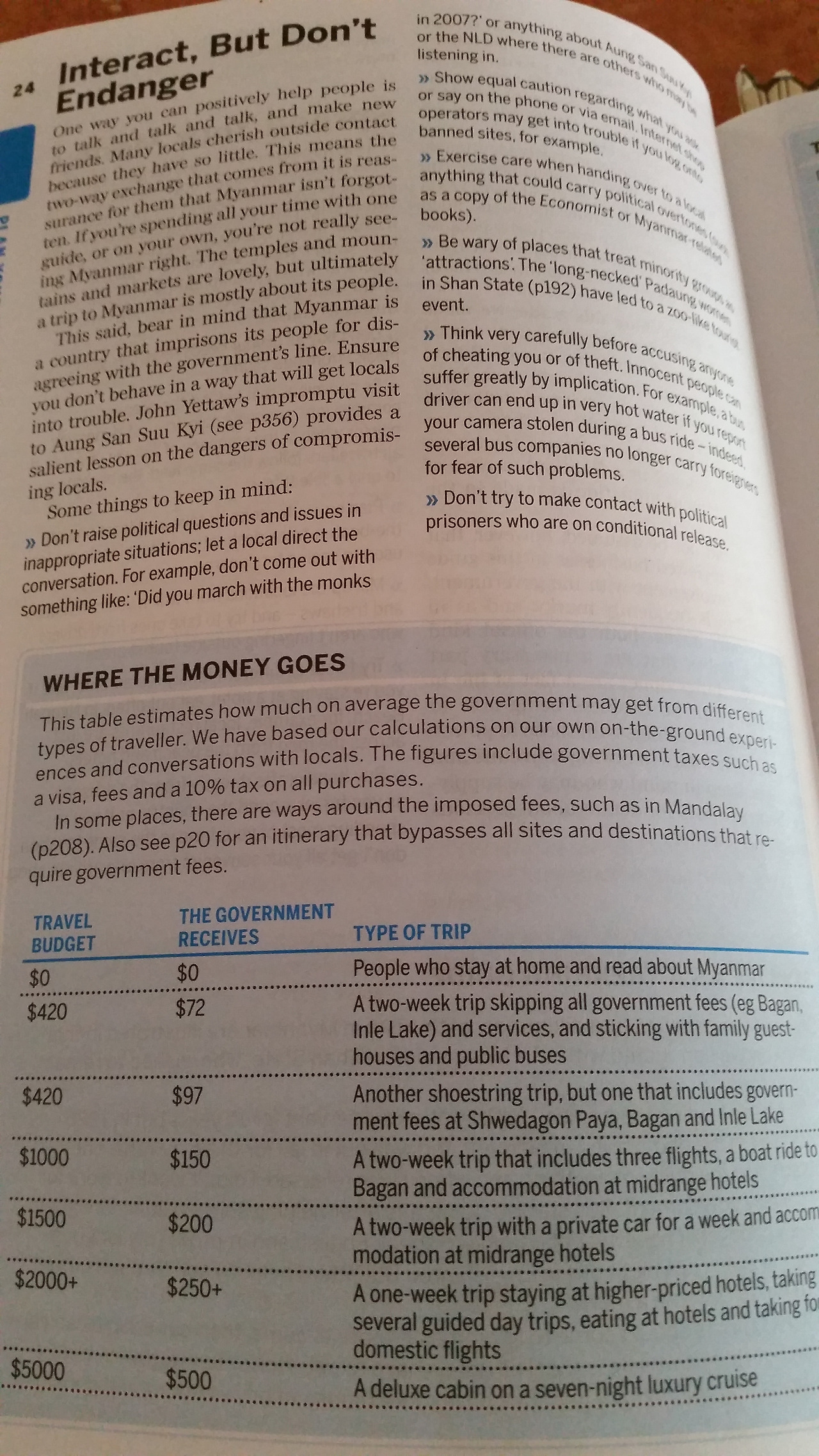 동네 도서관에 가서 미얀마 관련 서적들을 빌리기로 했다. 많지는 않았는데, 사서가 론리 플라넷 최신판을 누가 빌려갔고 출간한 지 5-6년 된 것이 있다길래, 뭐 얼마나 변했겠나 싶어 괜찮다고 빌려왔다. 이 가이드 북을 읽다가 몇 번을 울컥했다. 군사 정부가 빈한한 민간인들을 탄압하며 어떻게 관광산업을 운영하는지, 해외여행객들이 어떻게 지혜롭게 지출을 해야 하는지 등등 생각지도 못한 사회 문제들을 상세하게 다루고 있었다. 즉, 대형 여행사와 연계해서 단체여행을 하면 뭉칫돈이 군사 정부로 흘러가므로 가능하면 소형 여행사나 개인 가이드를 쪼개서 여러 번 구매해 수익이 민간인에게 돌아가도록 주의하라는 등의 얘기였다. (여행 일정이 잡히면 여행자들의 바이블이라 불리던 론리 플라넷을 동네 도서관에서 빌려 가볍게라도 꼭 읽던 루틴이 있었다. 아마도 이 여행이 가이드북을 찾아보던 마지막 시절이 아니었나 싶다. 지금은 온라인 정보가 널려있지만 요즘도 여행 전엔 다양한 관련 서적이며 다큐멘터리며 아이와 함께 틈틈이 찾아보려고 노력한다. 아는 만큼 보이는 것이니까)