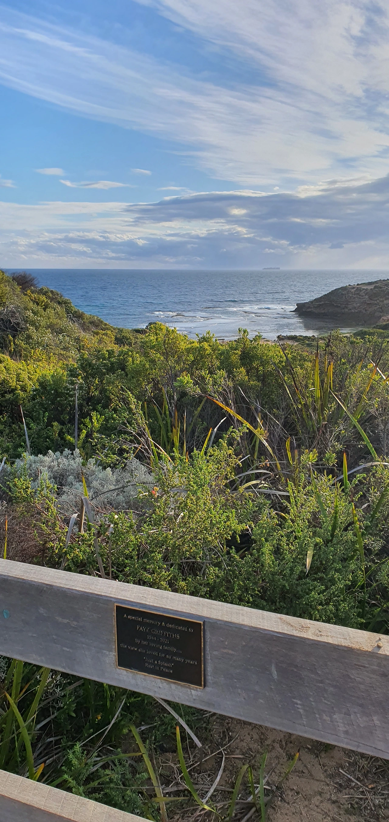 페이 그리핀스. 3년 전 77세로 죽은 그녀는 이 바닷가 풍경을 여러 해 동안 사랑했단다. 철썩이는 파도 소리 들으며 평안히 쉬시라고, 페이를 사랑했던 가족들은 그리움을 담아 작은 현판을 만들어 붙였다. 산책길 모퉁이, 수풀에 둘러 쌓인 쉼터의 작은 벤치에 앉아 몇 줄 안 되는 문장을 읽으며, 페이가 즐겼다는 풍경을 나도 바라본다. 파도 소리를 듣는다. 내 마음도 평안해진다. 수년 전 이 산책길을 꽤나 오르내렸을 페이를 만나고 그 가족의 사랑 담긴 마음도 헤아려 보며 걸음을 옮긴다.