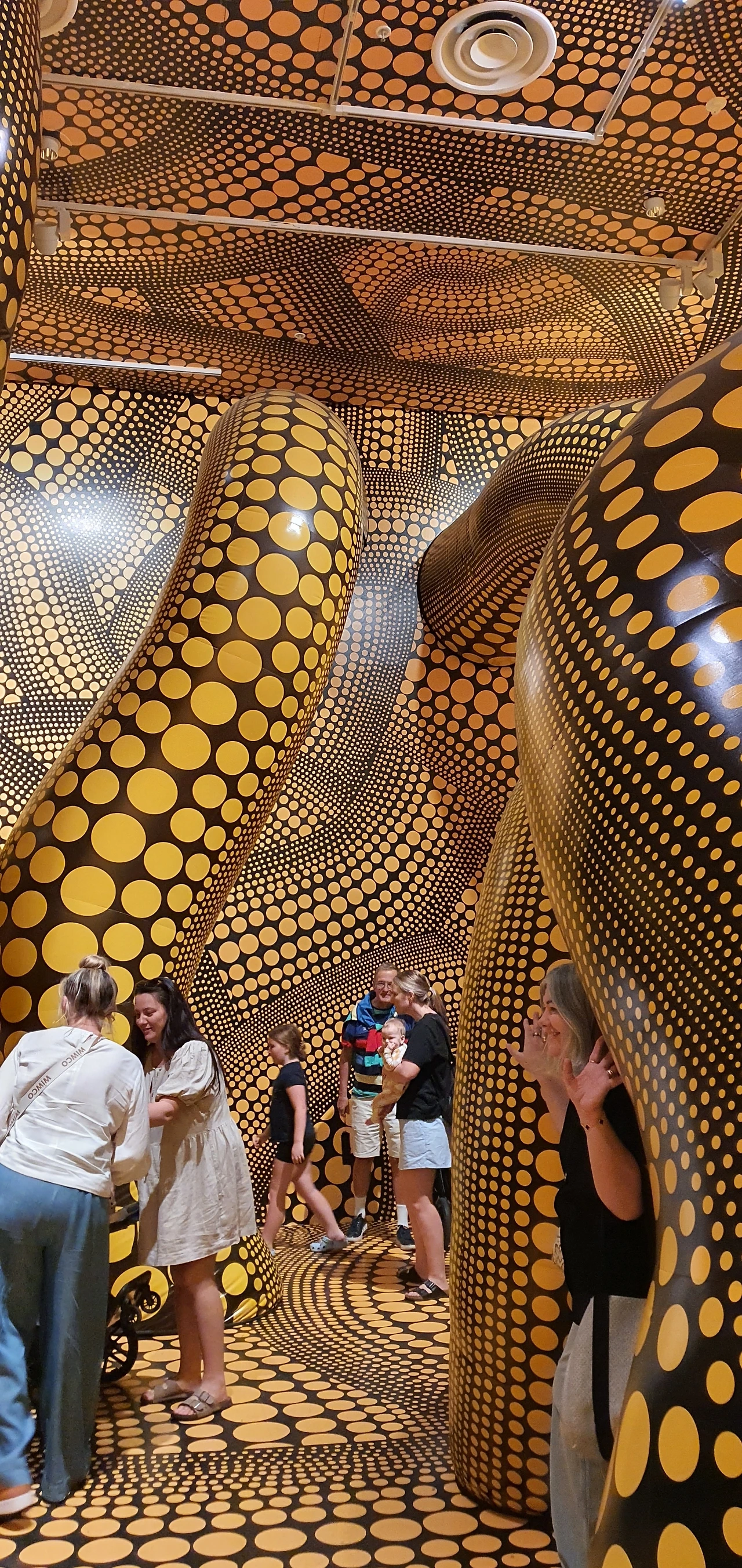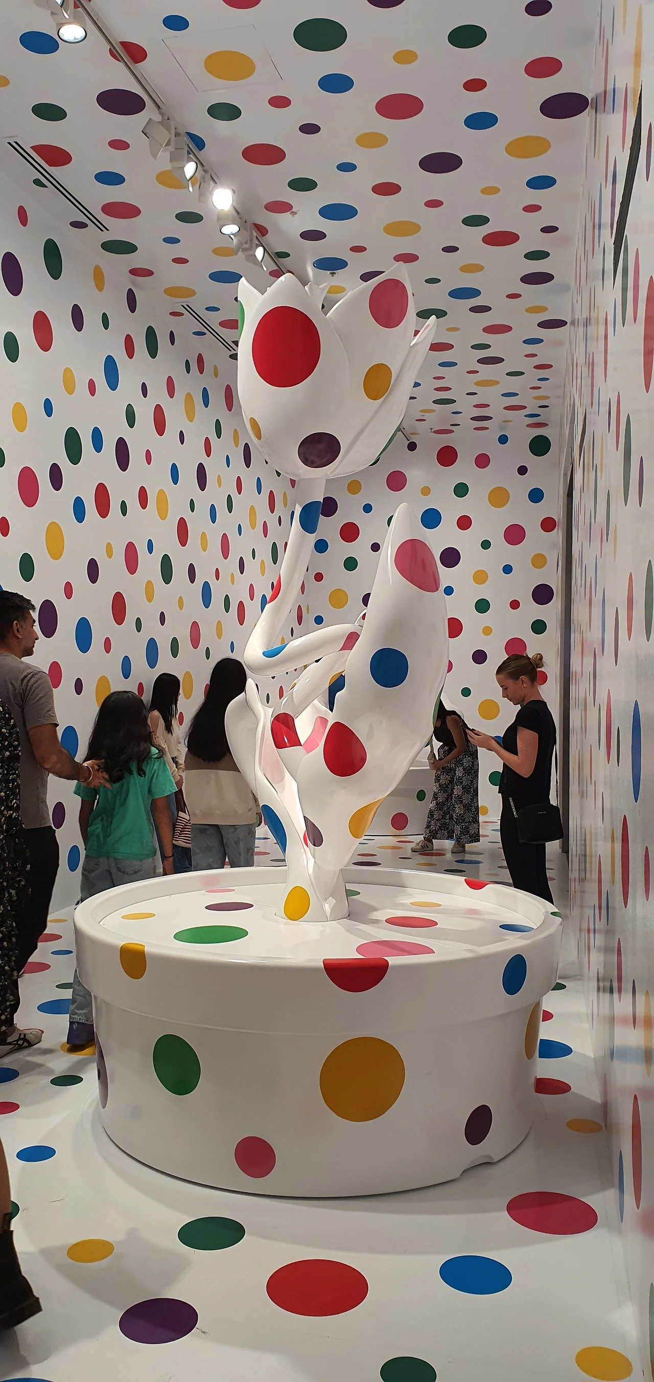 10여 년 전 태즈매니아 섬을 여행하다가 들른 MONA 갤러리에서 그녀의 전시를 처음 봤던 기억이 났다. 쿠사마에 대해 대충 떠올랐던 것들은 칼라풀한 점들로 그리는 여러 작품들이 그녀의 정신병과 환상에서 비롯되었다는 것, 우연히 크게 명성을 얻었지만 남은 인생을 정신병원에서 살아가며 온 세상에 점만 찍고 있다는 정도였다.