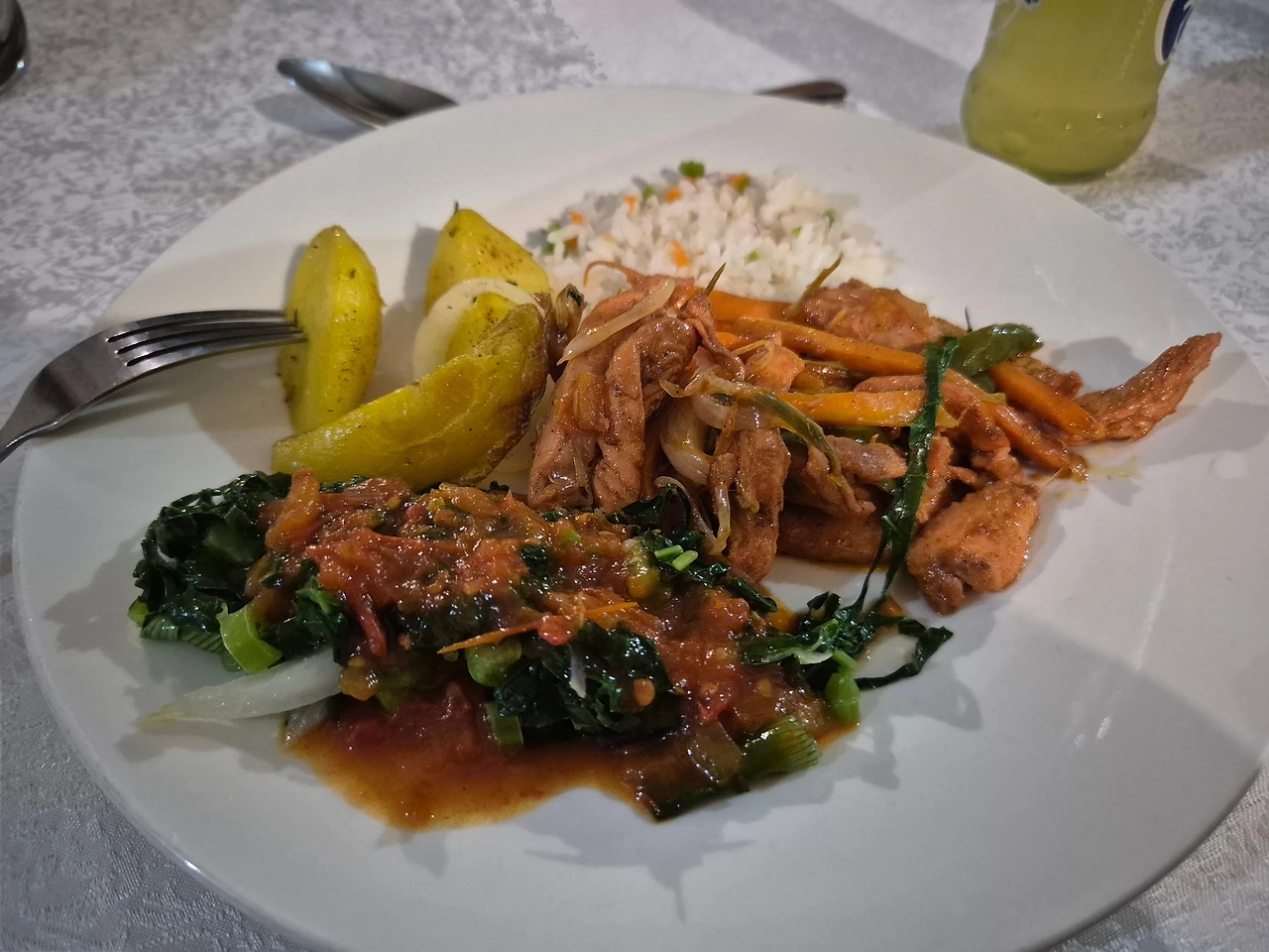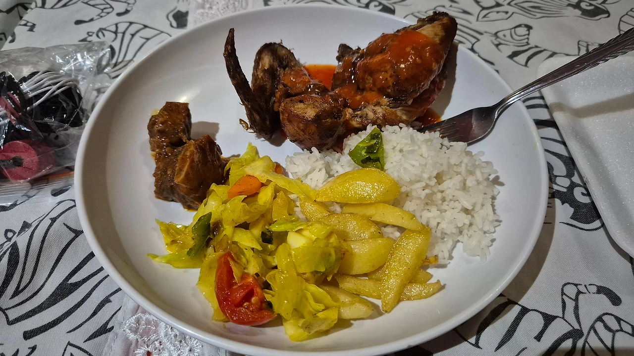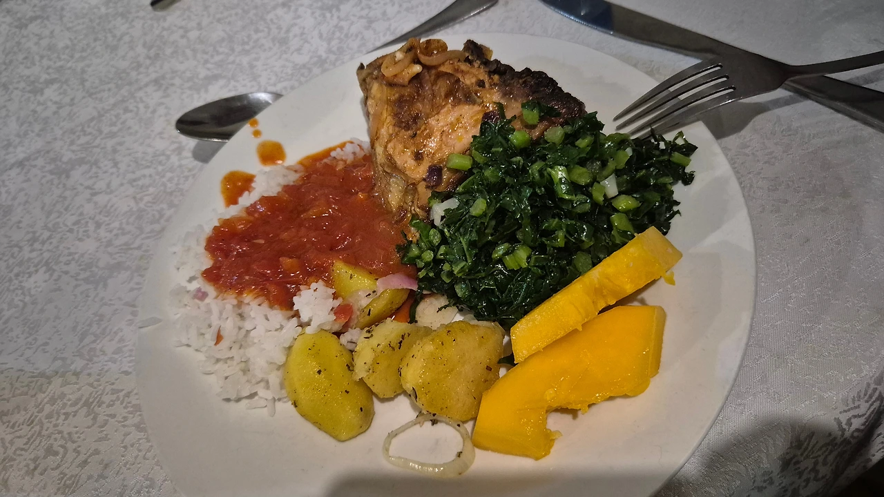 저녁은 밥이나 시마에 고기 한 종류, 야채 한 종류, 토마토소스류가 나온다. 밥은 동남아에서 먹는 흩날리는 것보다 오히려 더 한국 밥에 가깝다. 밥을 지은 뒤 잘게 썰은 당근이나 초록 야채를 조금 넣어 색깔을 낸다. 닭고기는 주로 튀겨서 나오는데 씹어도 씹어도 넘기기가 어려울 만큼 질기다. 양계장이 아닌 벌판을 뛰어다닌 닭이고 영계가 아닌 살만큼 산 노계이기 때문이리라. 같은 동물인데 육질의 차이가 이렇게 크다는 것을 평생 처음 말라위에서 배웠다.