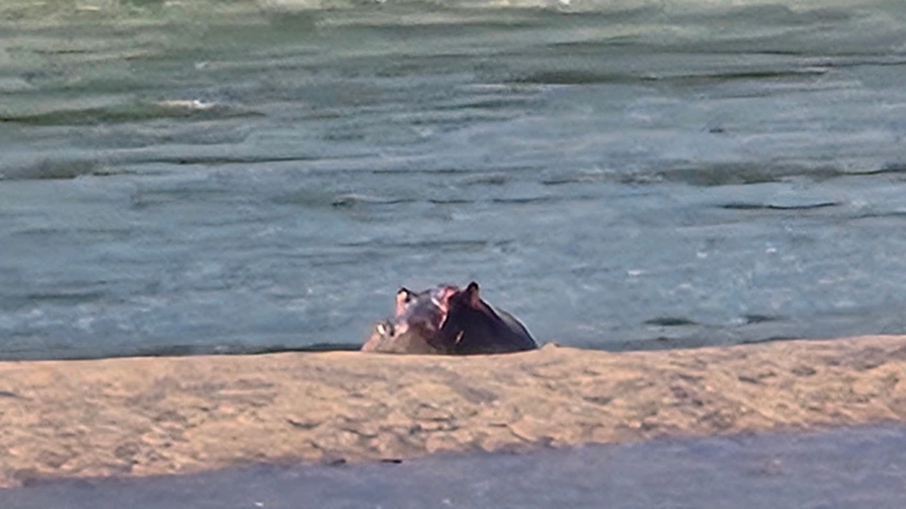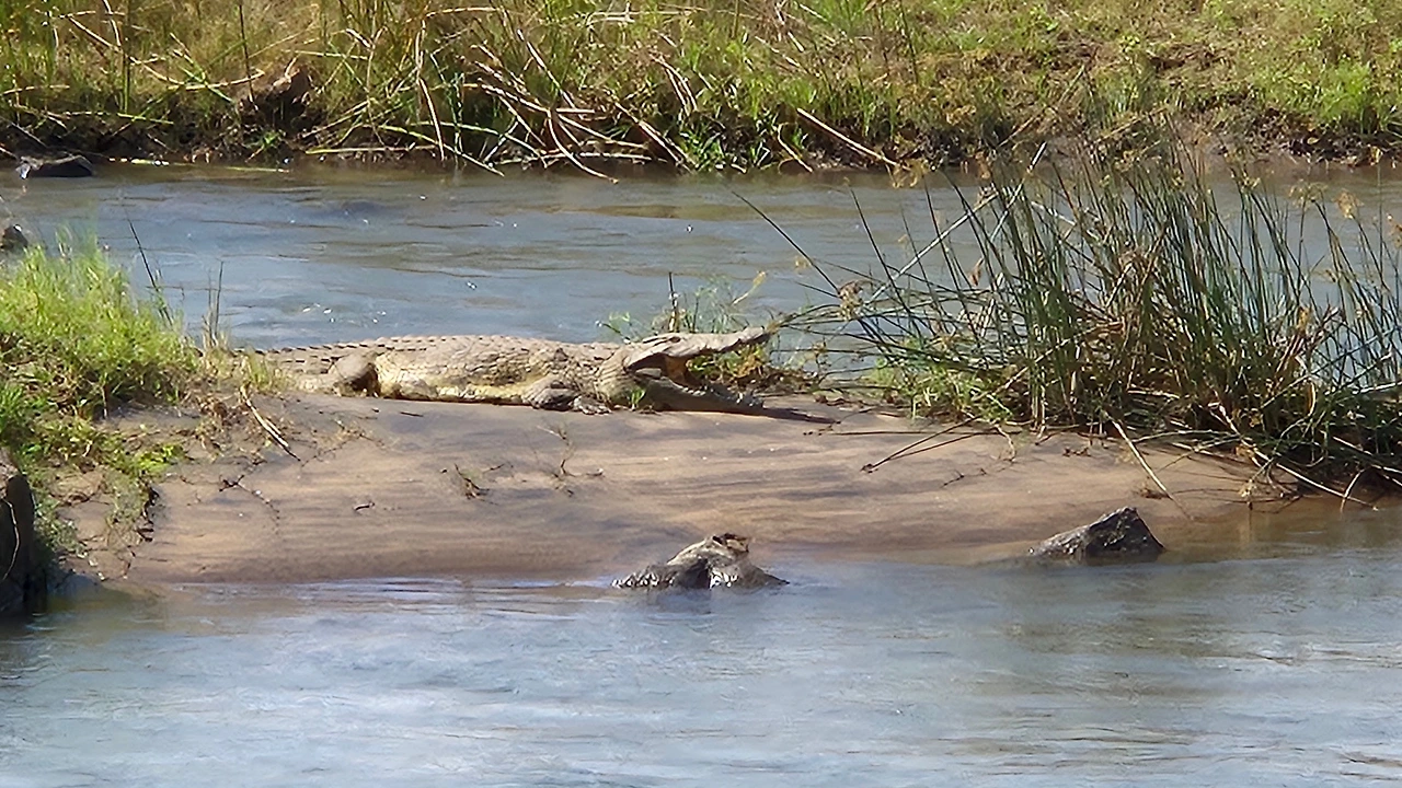 바위 위에서 하품하는 악어와 물속에서 수영하는 하마 떼가 평화롭게 오후 볕을 즐기고 있었다.