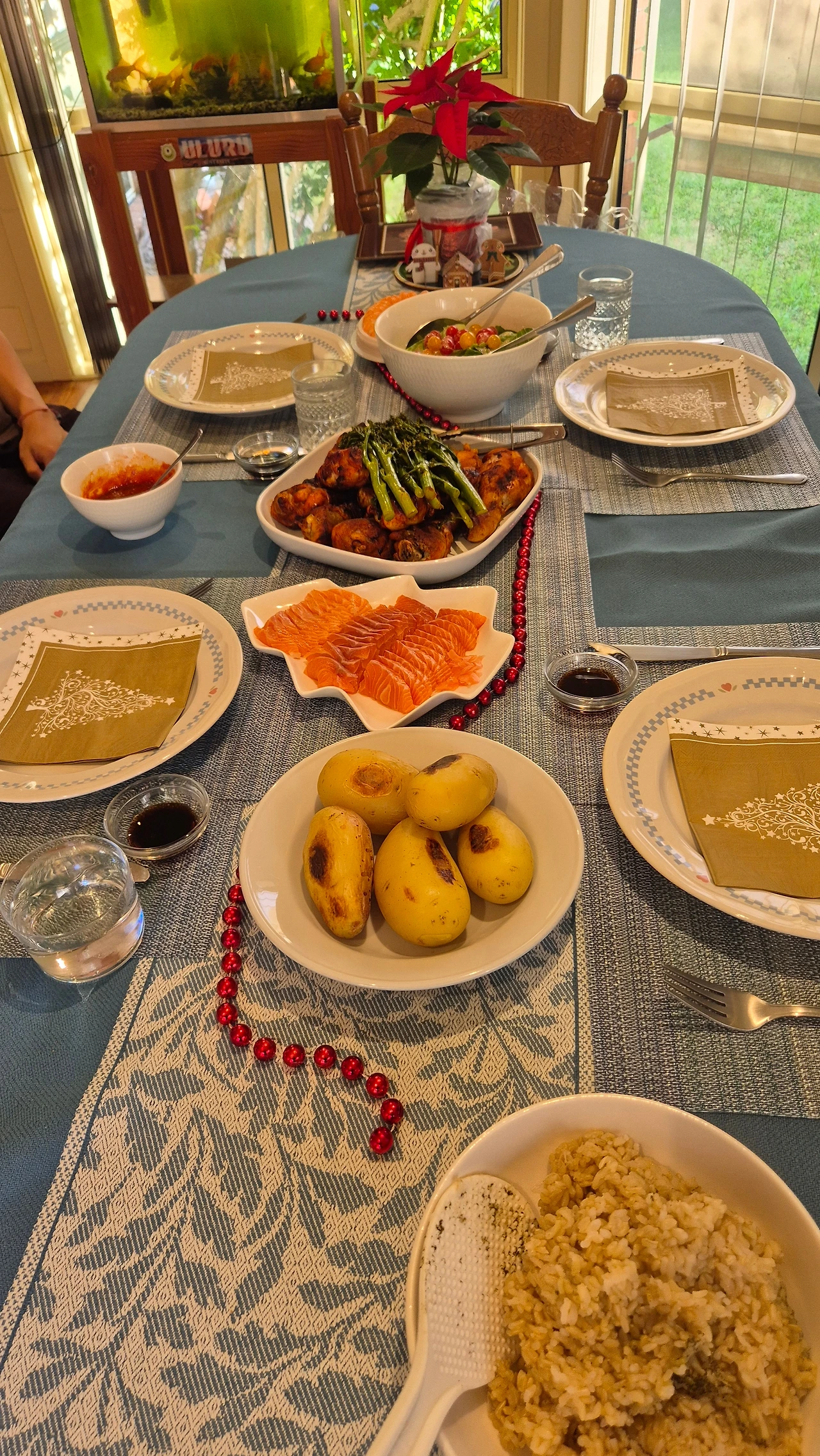 크리스마스엔 첫 코스로 해산물을 먹는다. 생굴과 찐 새우를 먹었다. 태국식 소스를 곁들인 굴이 신선했다. 두 번째 코스는 육류와 샐러드를 먹는데 한여름에 크리스마스를 맞는 호주에서는 차가운 햄을 먹는 경우도 많다. 이날은 오렌지 꿀 소스를 뿌려 두 시간 구운 돼지 넓적 다리 햄을 먹었다.