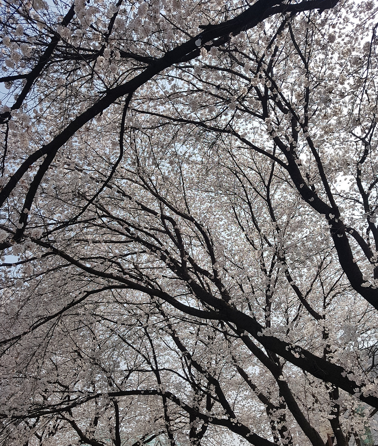 겨우내 목을 쭉 빼고 기다린 벚꽃이 밤에 내린 비와 강풍으로 벚꽃 잎이 바닥에 거의 떨어졌다.