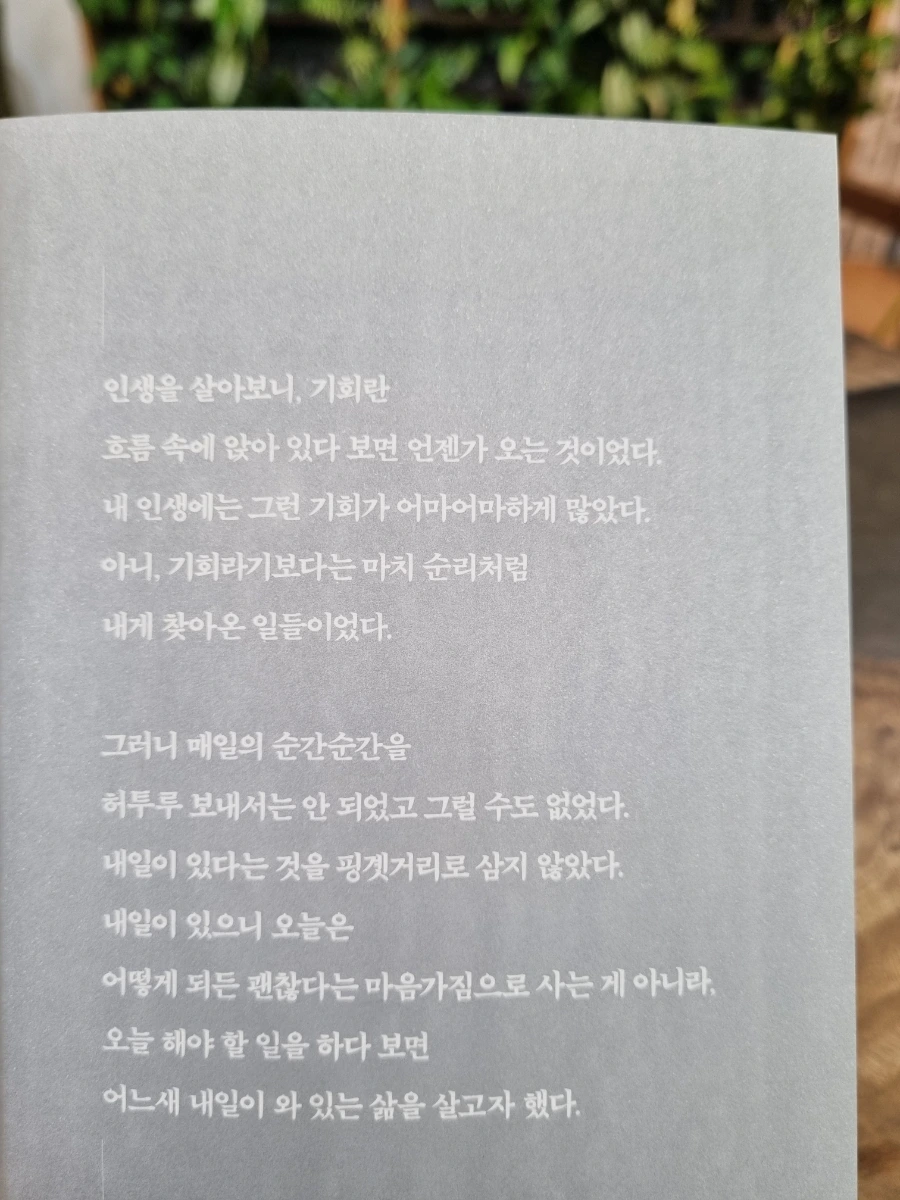 "인생을 살아보니, 기회란 흐름 속에 앉아 있다 보면 언젠가 오는 것이었다. 내 인생에는 그런 기회가 어마어마하게 많았다. 아니, 기회라기보다는 마치 순리처럼 내게 찾아온 일들이었다. 그러니 매일의 순간순간을 허투루 보내서는 안 되었고 그럴 수도 없었다. 내일이 있다는 것을 핑곗거리로 삼지 않았다. 내일이 있으니 오늘은 어떻게 되든 괜찮다는 마음가짐으로 사는 게 아니라, 오늘 해야 할 일을 하다 보면 어느새 내일이 와 있는 삶을 살고자 했다."