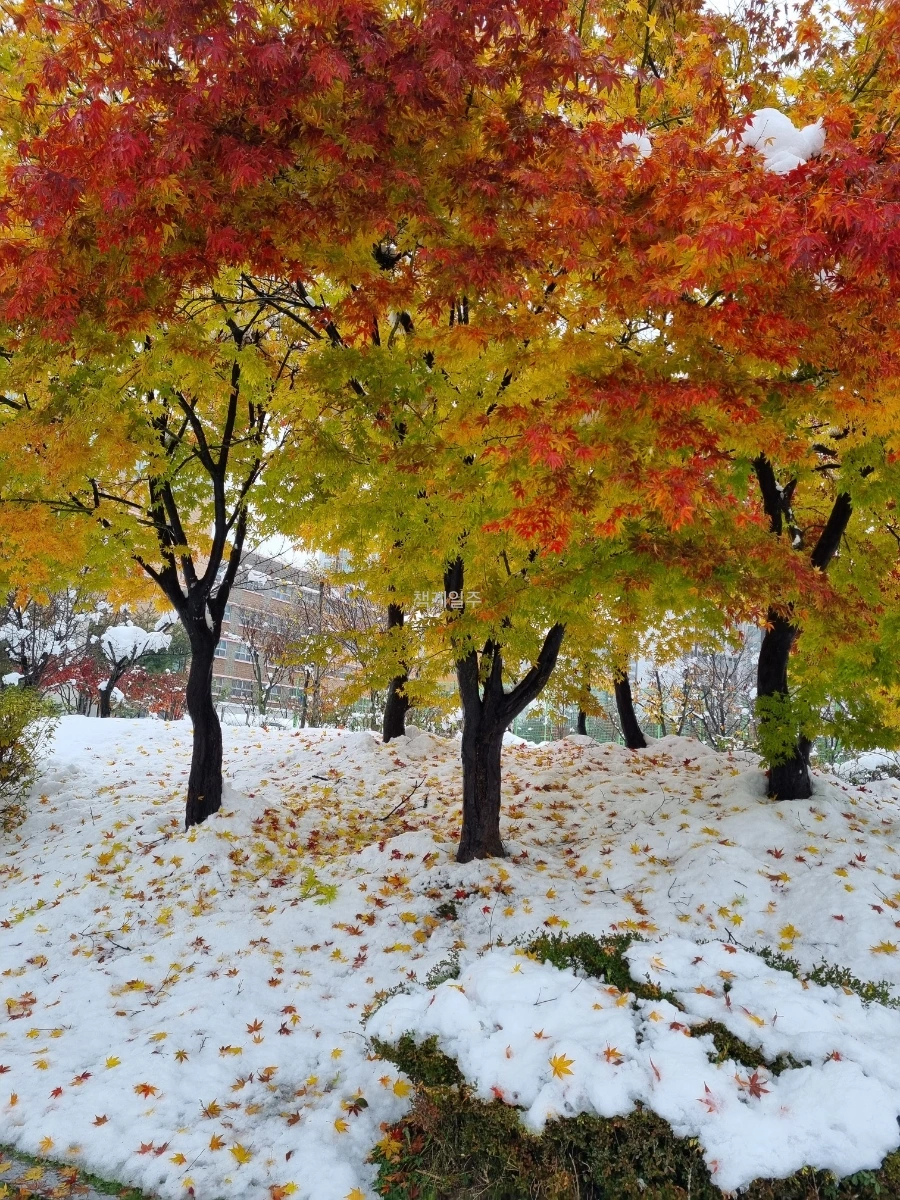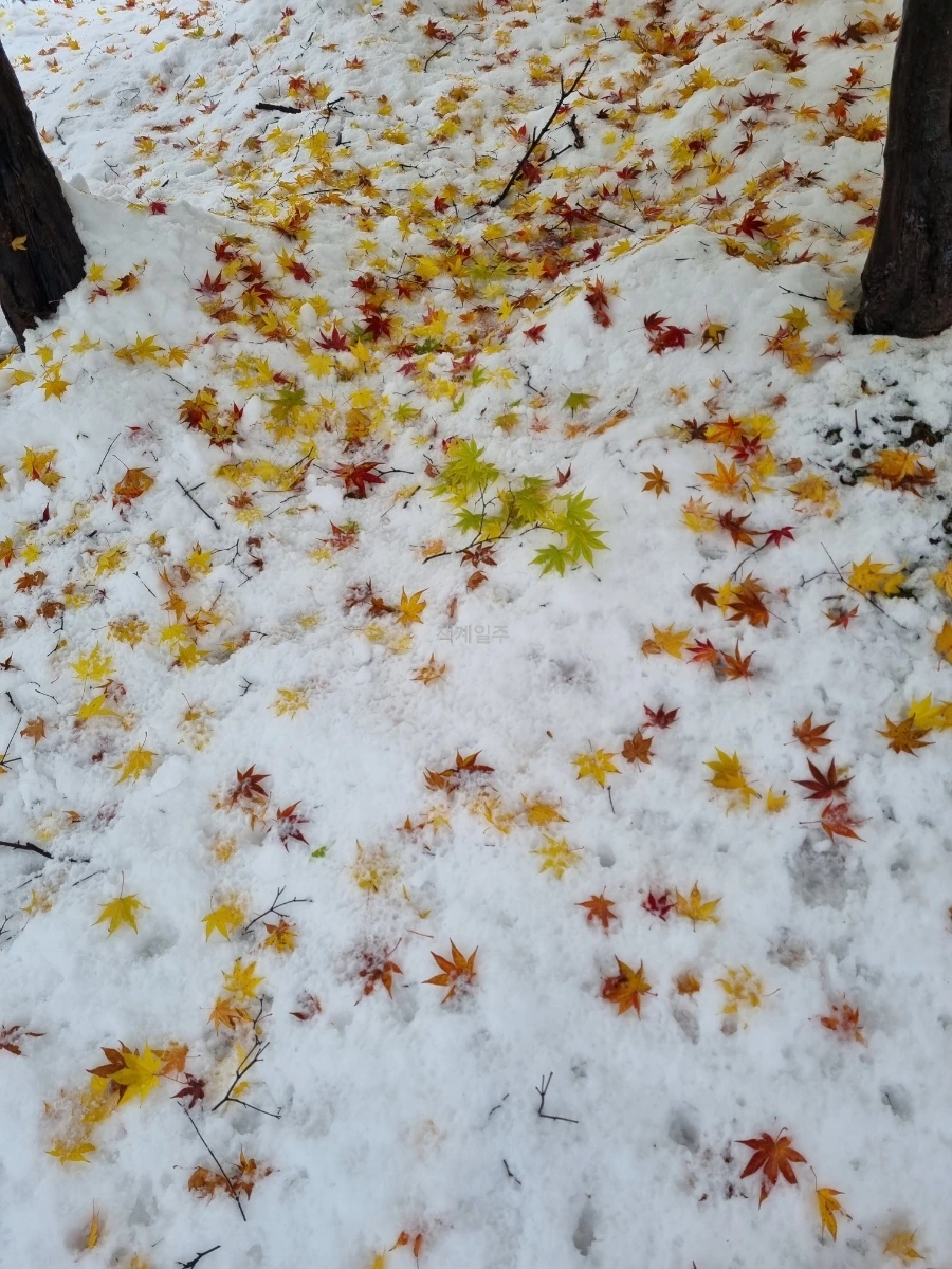 흠뻑 젖은 축축한 양말, 차가워진 손과 발, 질퍽한 도로를 지나가는 차 소리, 온통 하얀 길, 아직 제 생을 다하지 못한 단풍잎이 눈 위로 별처럼 내려앉았다. 가을이 가기 전에 겨울이 성급히 온 느낌이다.