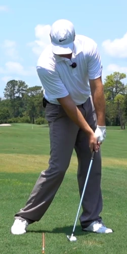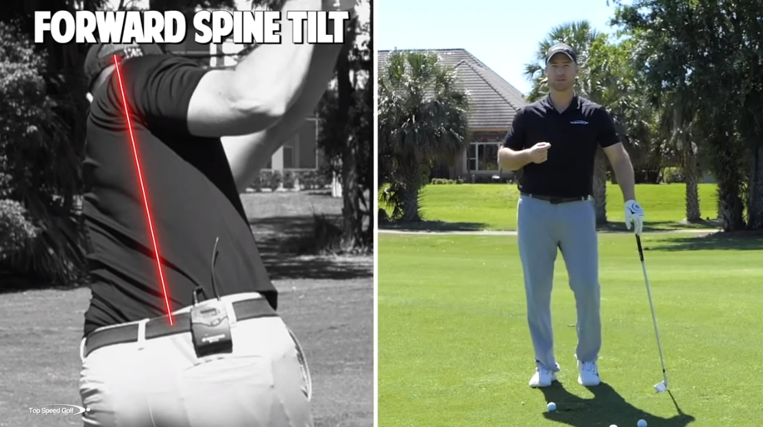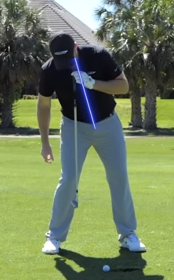 어드레스 마지막 단계에서 오른쪽 옆구리에 살짝 힘을 주어서 접는 느낌으로, 타겟 반대편으로 척추가 틸트되는 느낌을 추가해 주자.