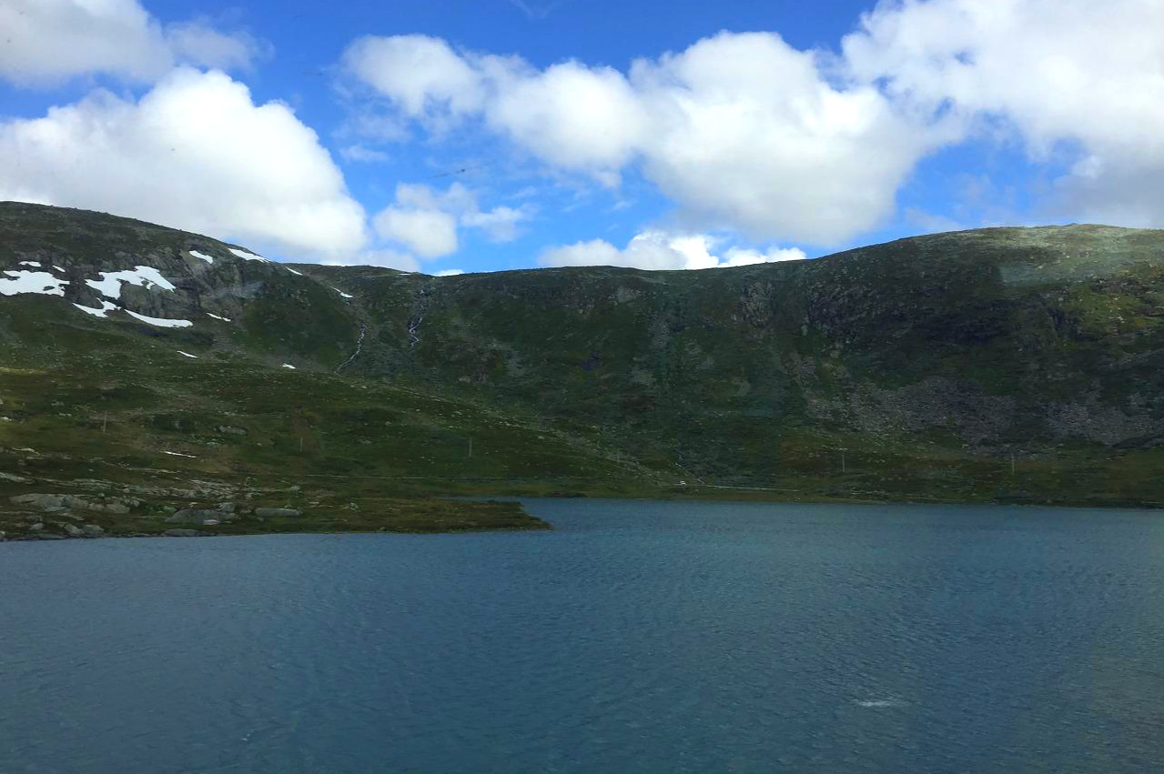송네 피요르드로 향하며 기차의 차창 밖으로 어느새 피요르드의 전경이 보이기 시작했다. 그리고 나의 눈을 사로잡은 것은 8월 하순의 여름에도 불구하고 산 위에 눈이 하얗게 쌓여있는 모습이었다.