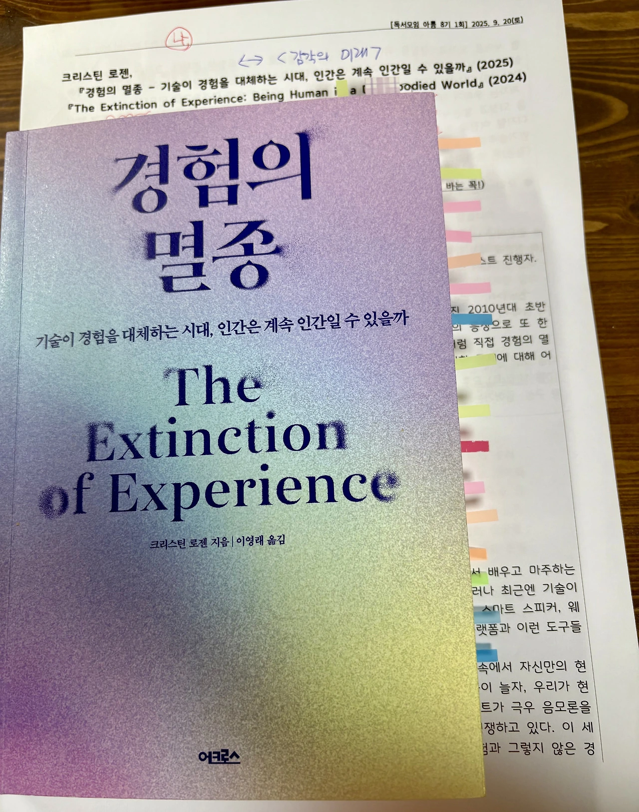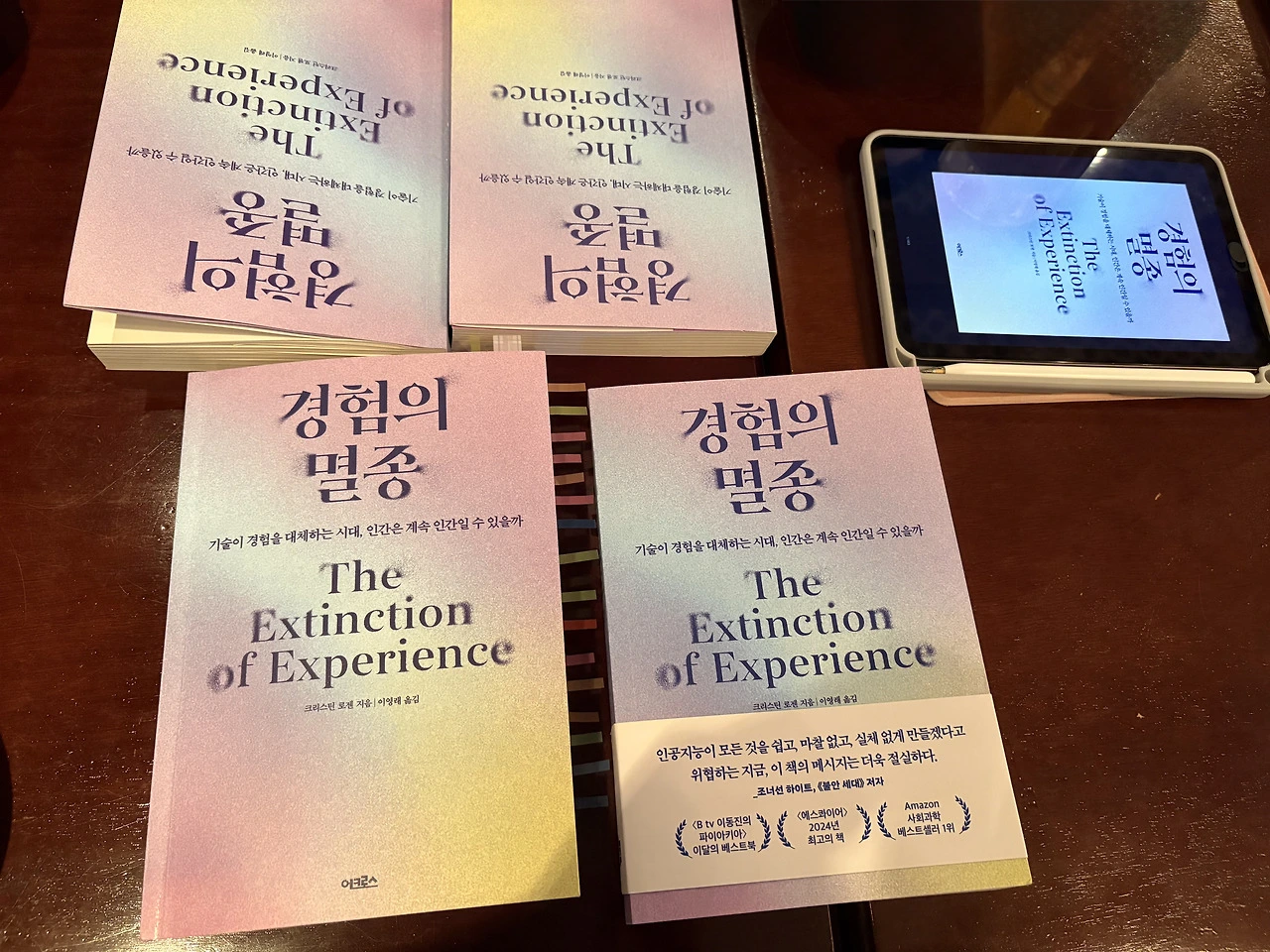 제목 : 원제는 <The Extinction of Experience: Being Human in a Disembodied World>(2024)이며, 우리나라에서는 <경험의 멸종 – 기술이 경험을 대체하는 시대, 인간은 계속 인간일 수 있을까>라는 제목으로 2025년에 번역 출간되었습니다.