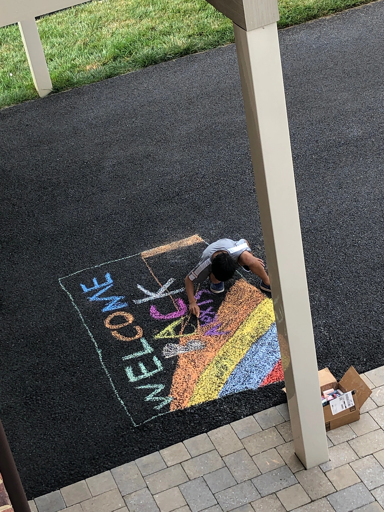 어느 날은 방바닥을 한참 긁다가 동네 개울가에 가서 돌멩이를 주워 오기도 하고, 다음날은 주워온 돌멩이를 물감으로 색칠하고, 비 오는 날은 에어컨을 틀어놓고 도리토스를 집어먹으며 영화도 한 편 봤다. 무더위에 나 혼자 아들 둘을 감당하려니 얼마나 하루가 영겁 같고 동네 아이들이 보고 싶던지, 나중에는 날짜를 세면서 기다렸다. 머리에서 김이 모락모락 피어오르던 시간이었다. 옆집 누나가 텍사스에서 돌아오던 날 아침, 드라이브웨이에 그림을 그리겠다며 나간 아들이 뭘 하는지 내다봤더니 누나네 집 앞에다 분필로 "Welcome Back" 사인을 그리고 있는 거였다. 큰아이도 친구들이 어지간히 그리웠었나 보다. 옆집 누나는 휴가지에서 아이들 선물까지 살뜰하게 챙겨다 주었고, 오랜만에 다시 뭉친 동네 아이들은 눈물겹게 반가워하며 매일같이 깔깔거리며 함께 놀았다.